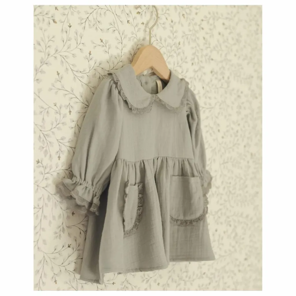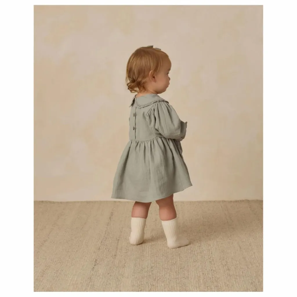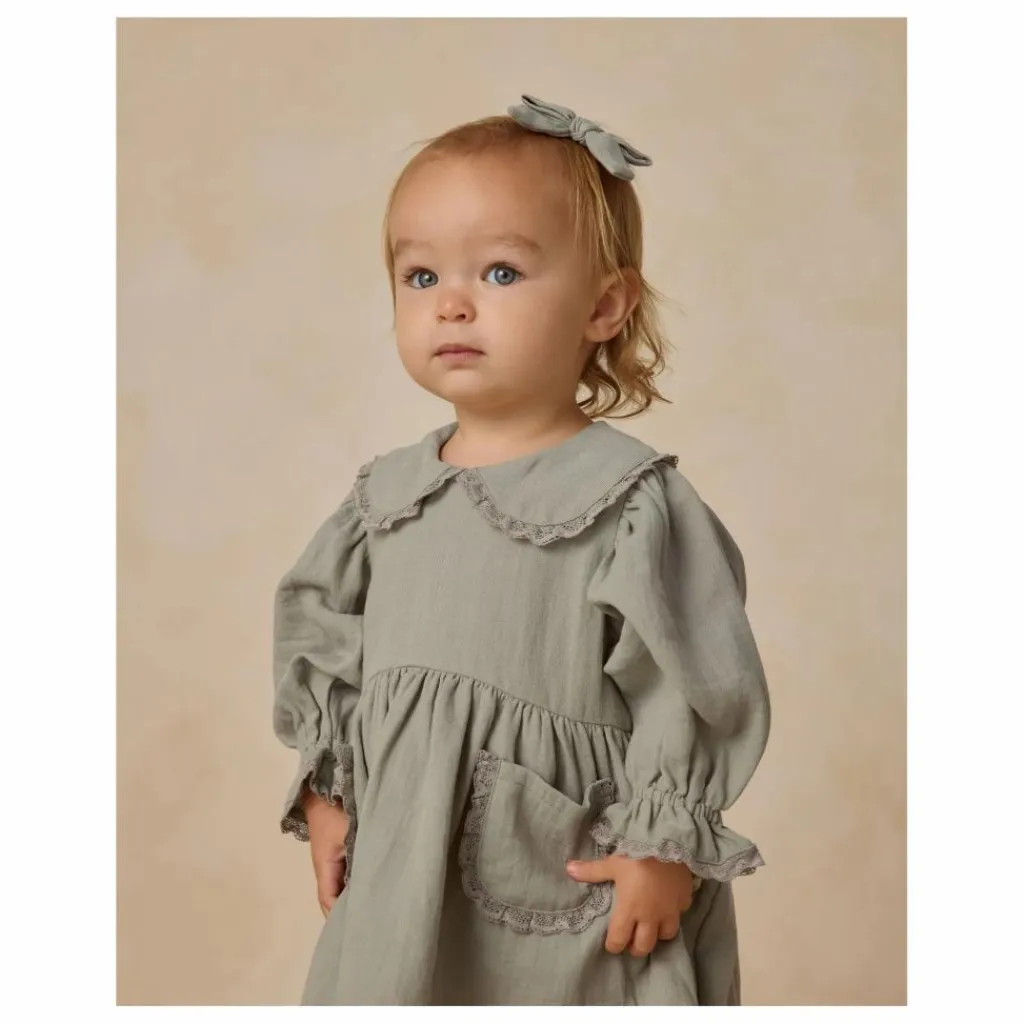 - La robe Marisol est dotée d’un col Peter Pan, de poches plaquées et de manches froncées, le tout orné d’un délicat volant de dentelle, et de boutons en noix de coco au dos pour faciliter l’habillage. Les culottes bouffantes coordonnées sont incluses dans toutes les tailles, dans notre teinte « bleu acier ».
