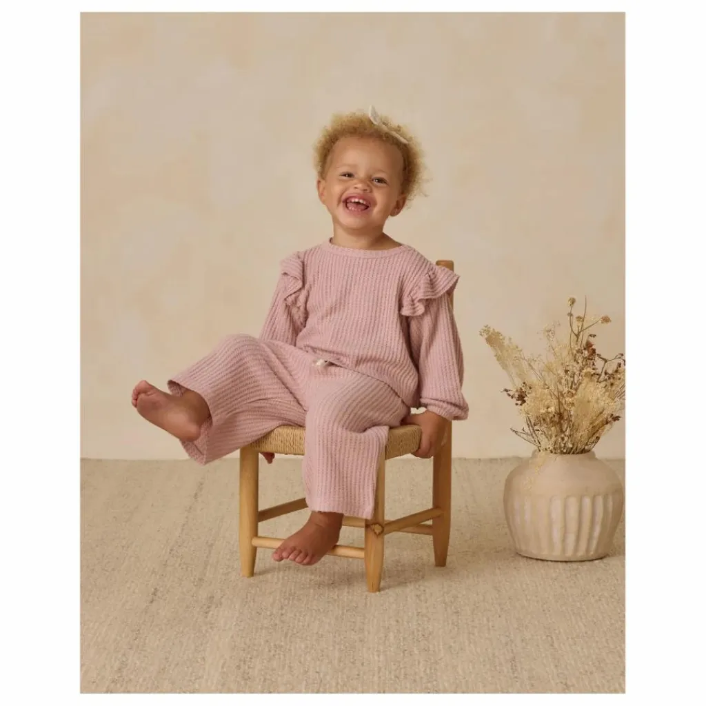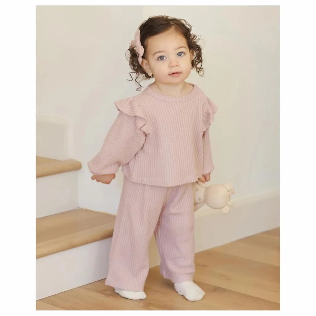 - Conçu pour les journées douillettes, cet ensemble adorable en tricot gaufré duveteux comprend un haut à manches longues avec des épaules à volants et un pantalon à jambes larges doté d’une taille élastique et d’un cordon de serrage fixe en coton.