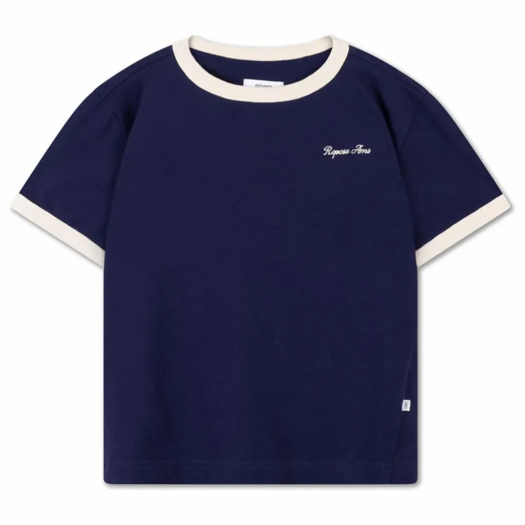 - Tee Shirt – Cosmic Navy Un tee-shirt bleu marine à l’allure rétro, grâce aux détails contrastés du col et des manches. Un logo brodé sur le devant apporte un accent subtil. Le logo brodé sur le devant apporte un accent subtil. Doux et respirant, il se porte tous les jours. Matières : 100% coton biologique