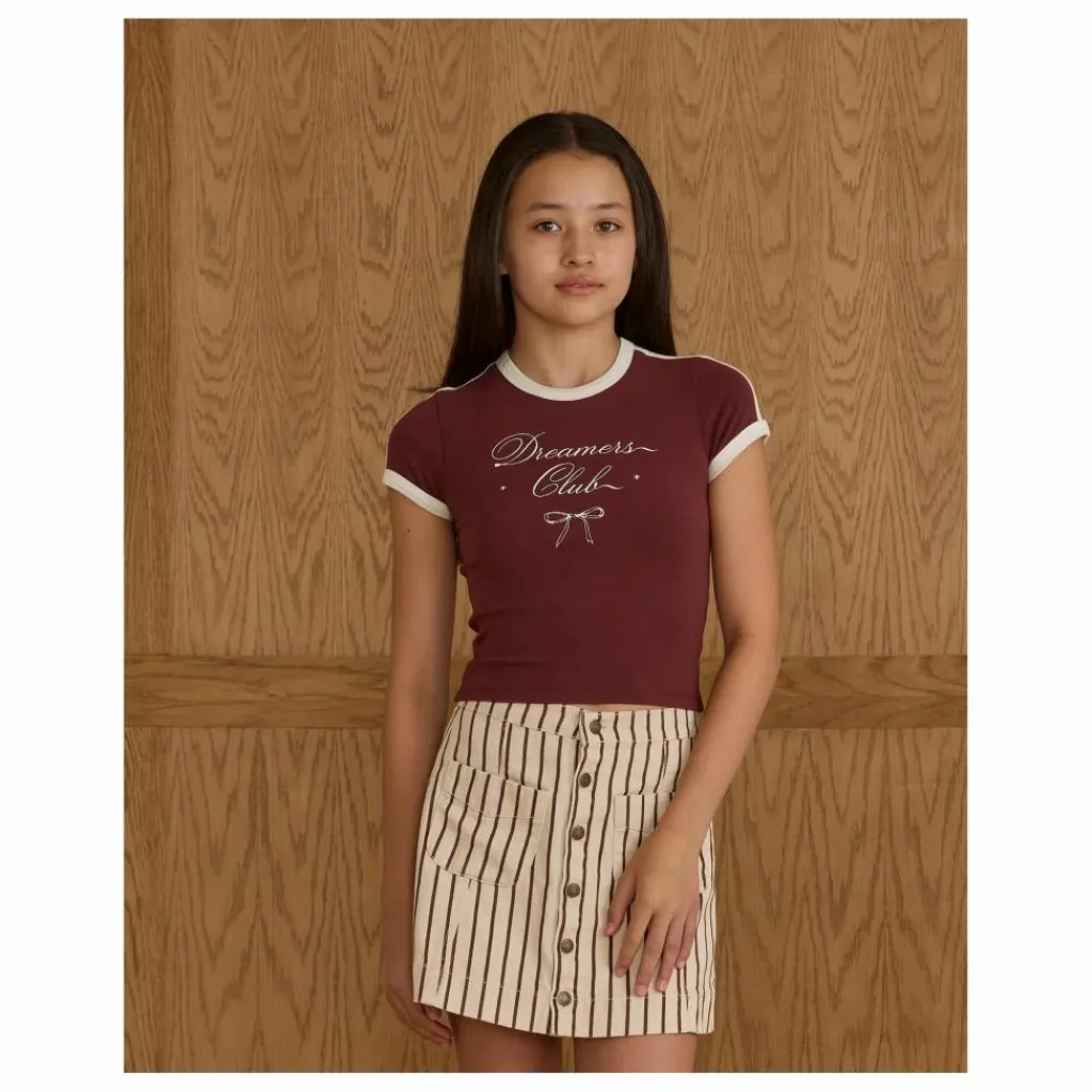 - Baby Tee à rayures contrastées à l’encolure, aux épaules et aux manches pour un look sportif et original, avec notre imprimé « dreamers club » sur notre teinte « burgundy ».