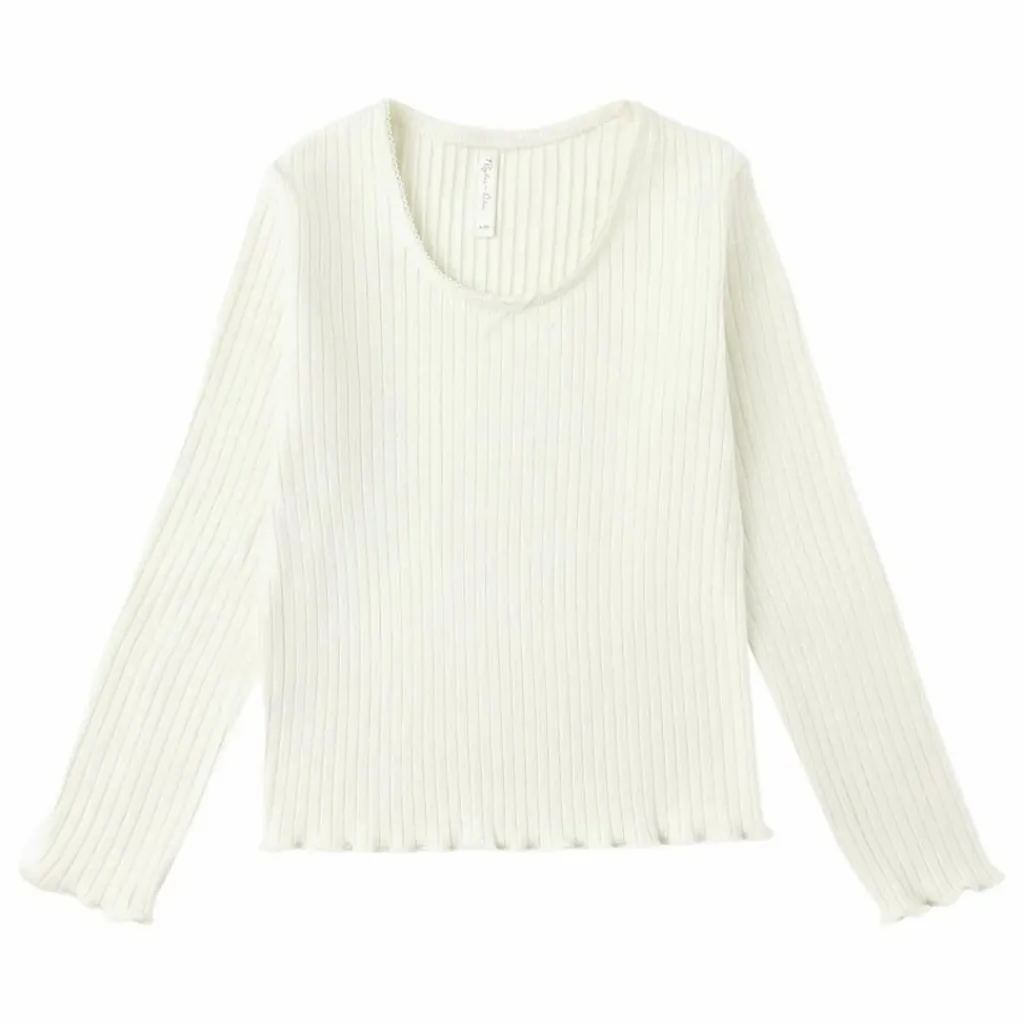 - Ce haut à manches longues en côtes présente un ourlet délicat en bord de laitue, une encolure bordée de dentelle et un joli nœud en satin, dans notre teinte « ivoire ».