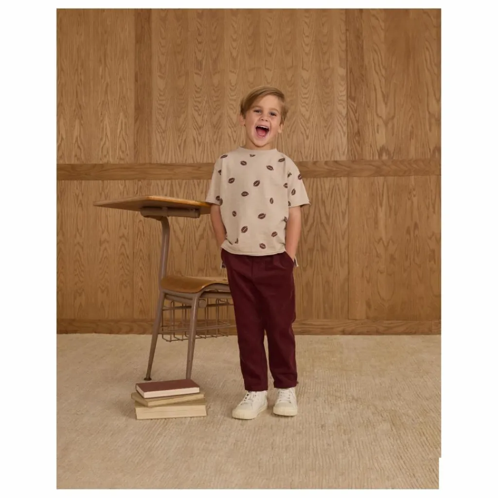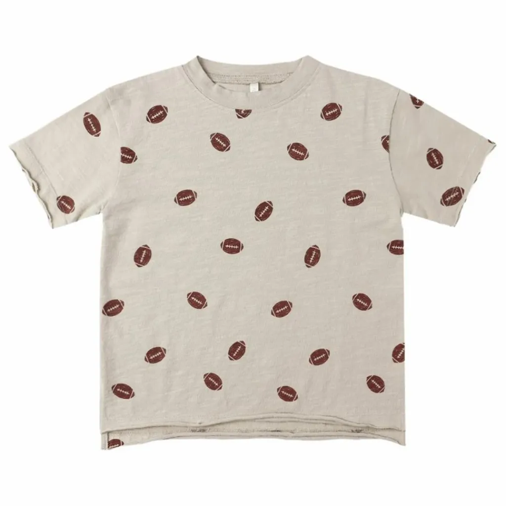 - Ce tee-shirt confortable en coton présente un ourlet à bords bruts pour un look décontracté. Des boutons-pression aux épaules sont inclus dans les tailles 0-3M – 18-24M pour faciliter les changements. Avec notre imprimé « football » sur notre teinte « stone ».