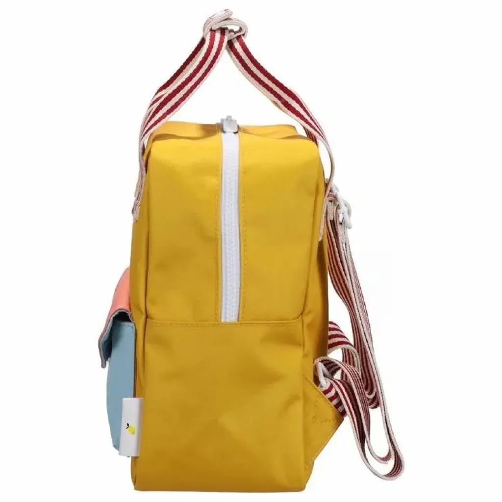 - Ce sac se distingue par son mélange de couleurs ! Il est doté d’une poche supplémentaire sur le devant, d’une doublure imperméable avec un motif dessiné à la main et de bretelles réglables. À l’intérieur, vous trouverez une bande élastique qui sert de porte-bouteille et une poche sur tout le dos qui se ferme à l’aide d’un velcro. Il y a aussi un badge pour mettre vos informations.