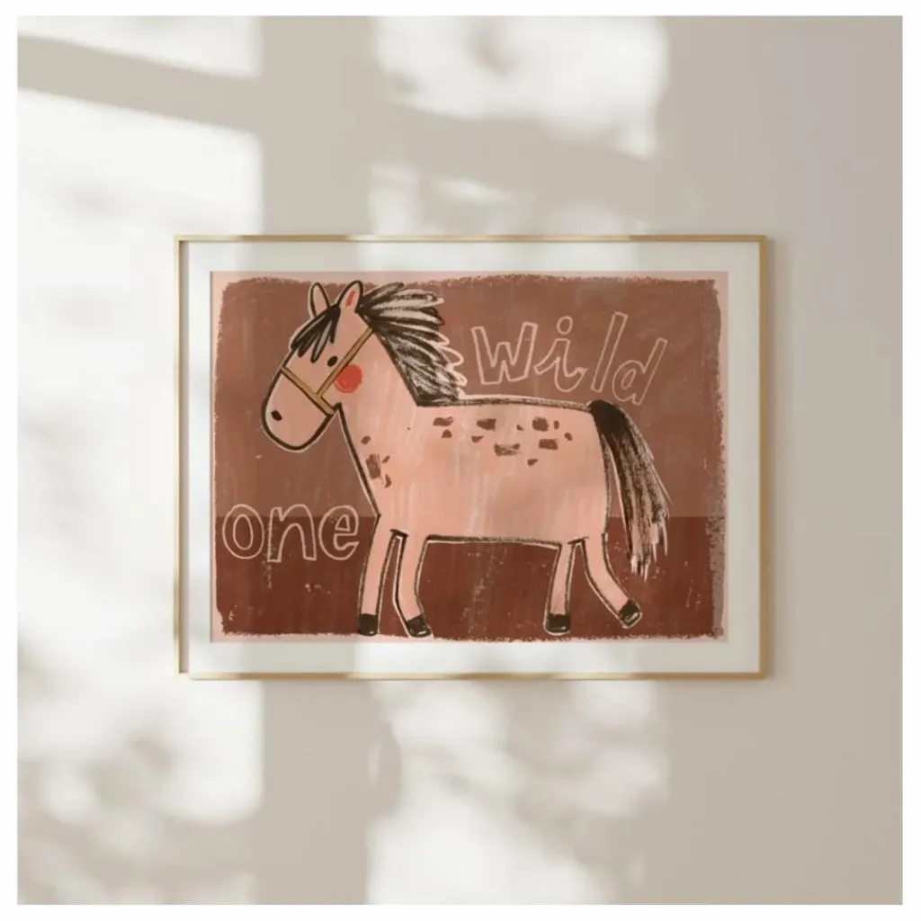 Ajoutez une touche d’aventure et de charme à la chambre de votre tout-petit avec cette magnifique affiche illustrée « Wild One » représentant un cheval, signée Studioloco.