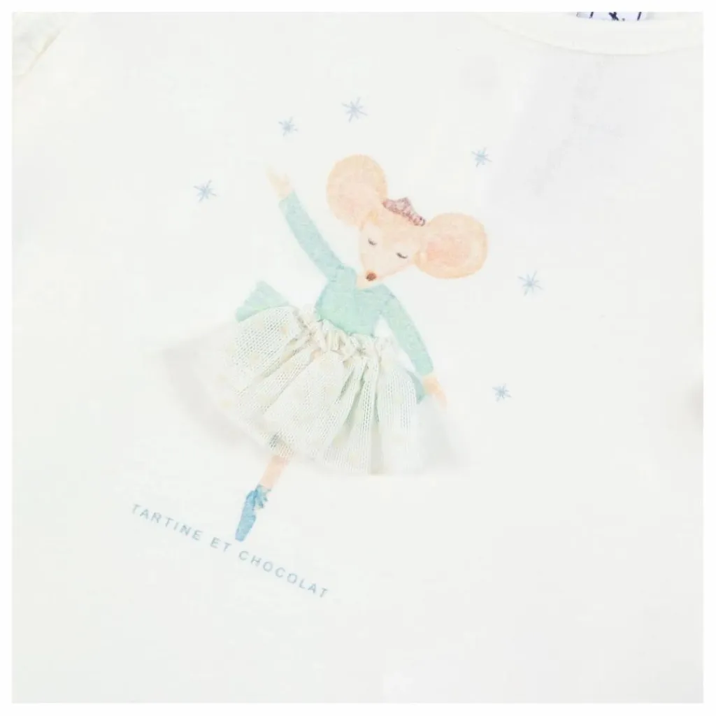 - Ce t-shirt manches longues écru pour bébé fille, orné d’une illustration poétique d’une souris en danseuse classique, apporte une touche de douceur et de légèreté à la garde-robe hivernale. Confectionné dans une matière douce, il assure un confort optimal pour les petites explorations de bébé. Facile à associer avec un short en tweed ou un legging, il crée une tenue à la fois élégante et chaleureuse pour l’hiver.