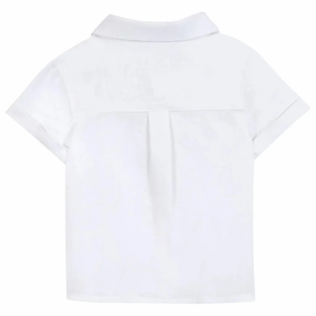 - Cette chemise blanche en lin à manches courtes et col pointu est idéale pour une cérémonie estivale. Son élégance naturelle et sa légèreté habillent les petits garçons avec style et confort. À associer avec un pantalon chic pour un look raffiné et distingué, idéal pour les moments spéciaux de bébé.