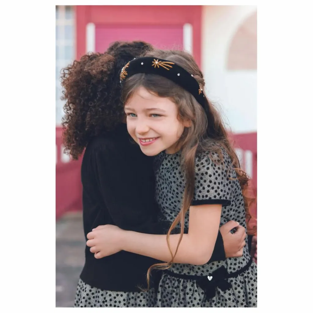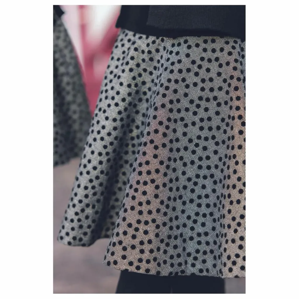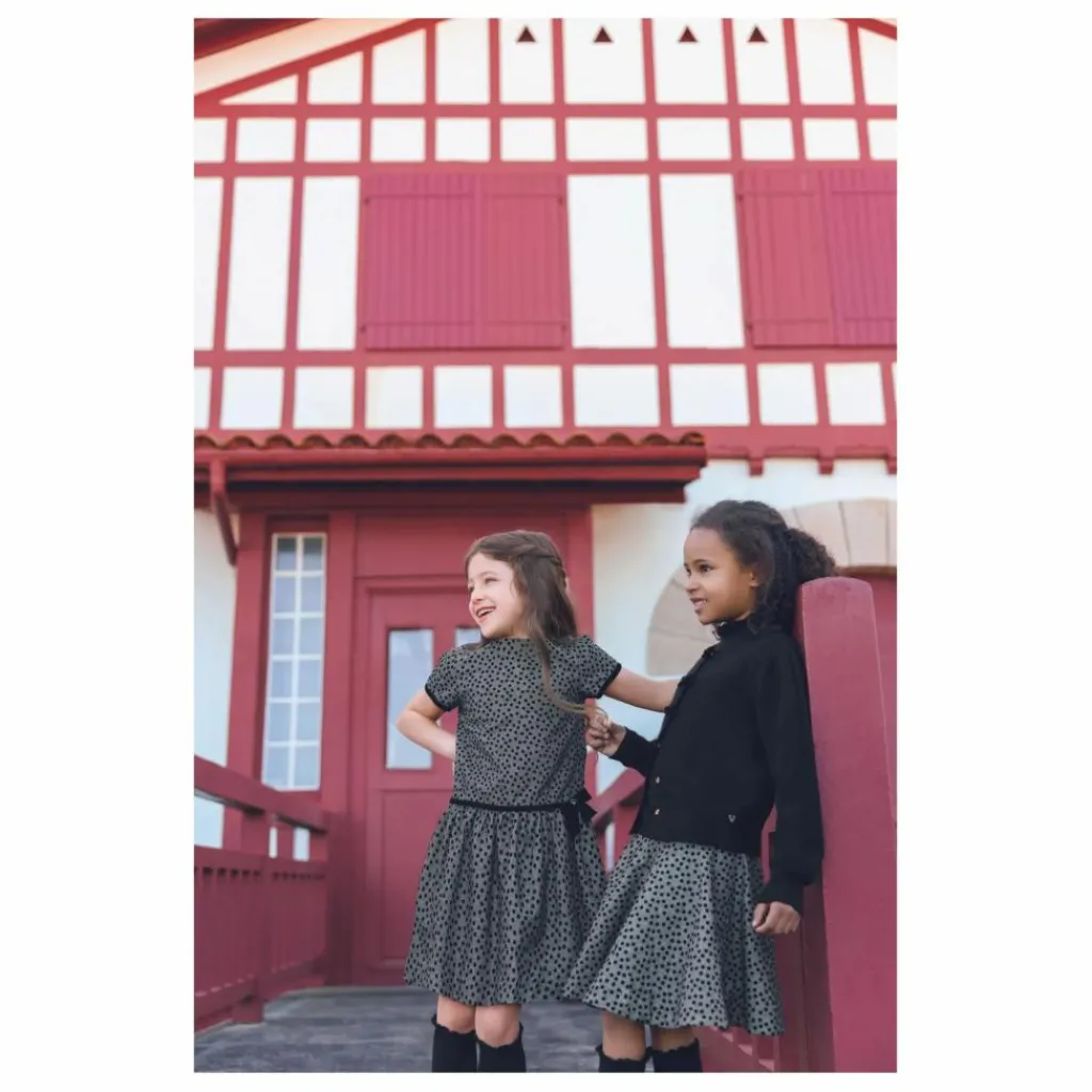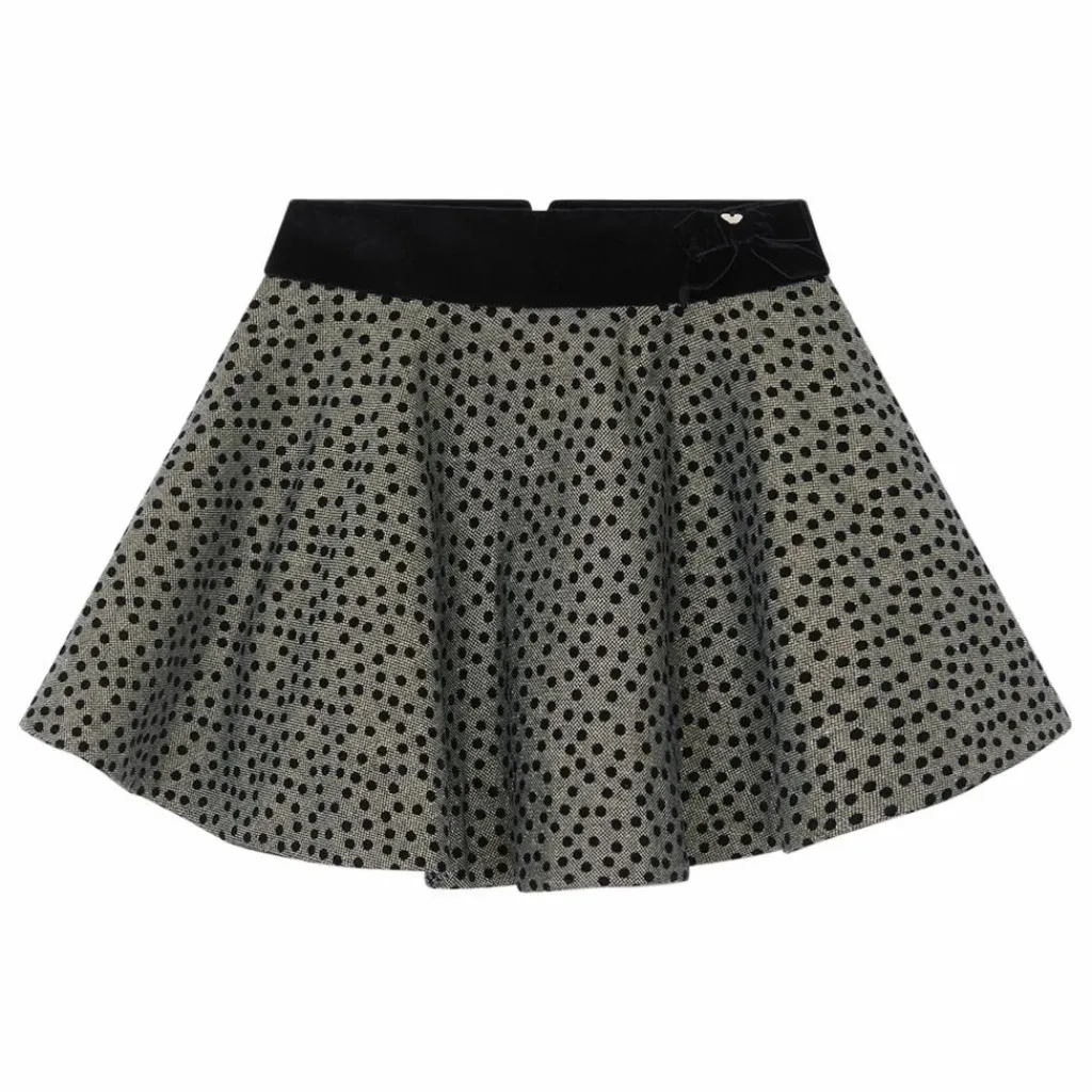 - Cette jupe pour junior fille, en couleur noire, se distingue par son motif à pois et son bandeau en velours noir à la taille, agrémenté d’un joli nœud. Élégante et raffinée, elle est parfaite pour créer une tenue chic et intemporelle, tout en apportant une touche de douceur avec son détail en velours.