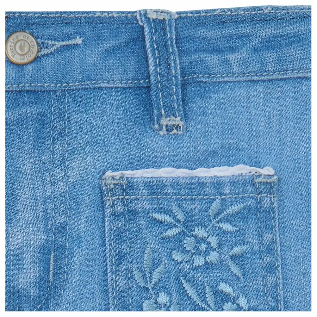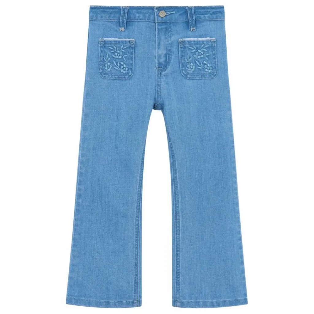 - Ce jean bleu denim évasé pour fille se distingue par ses poches à l’avant, ornées d’une délicate broderie fleurie et du monogramme TC brodé. Élégant et confortable, il est parfait pour compléter une tenue estivale avec une touche de raffinement.