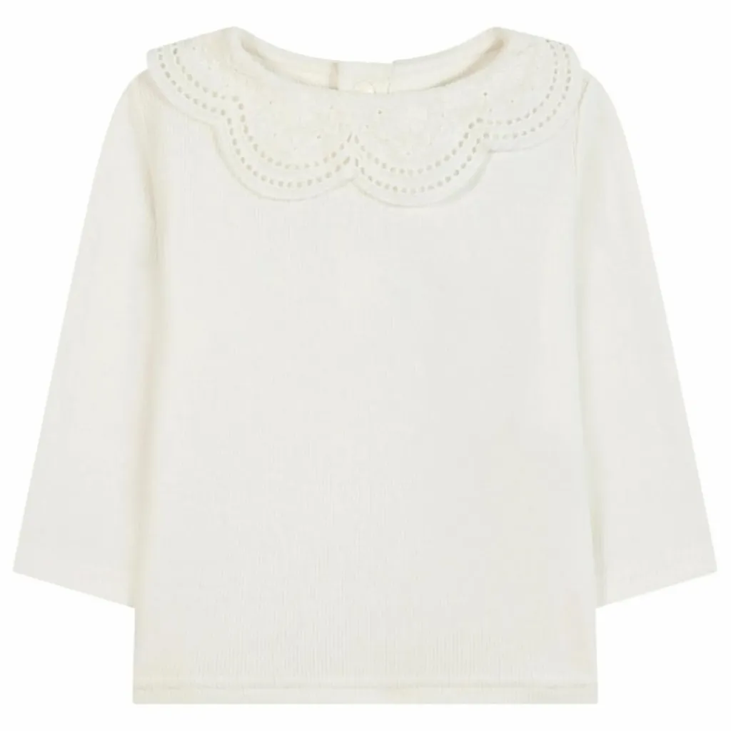 - Ce t-shirt côtelé à manches longues est idéal pour tous les jours. Sa couleur écru s’accorde parfaitement avec de nombreuses tenues. Son élégant col en dentelle apportera une touche délicate au look de votre petite fille.