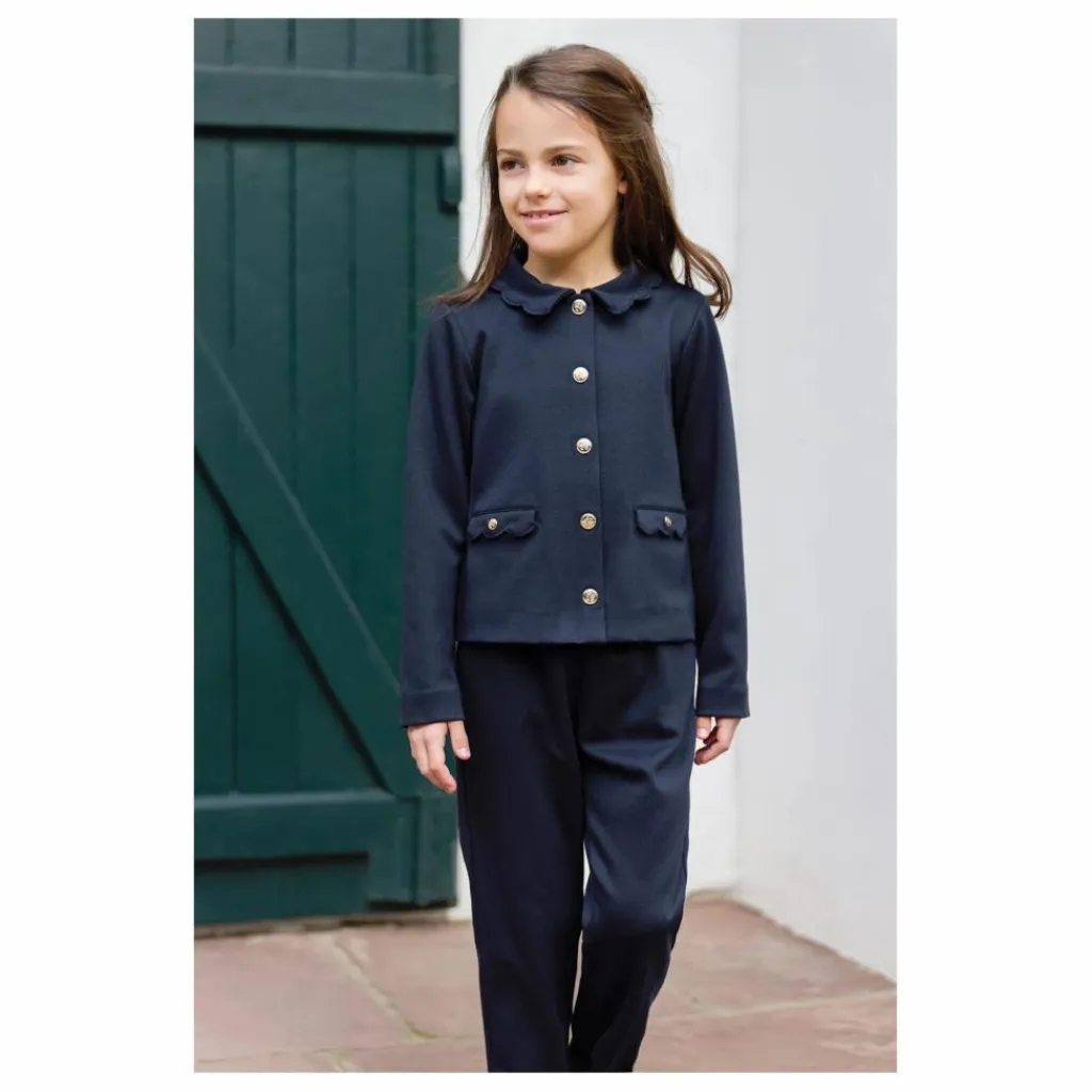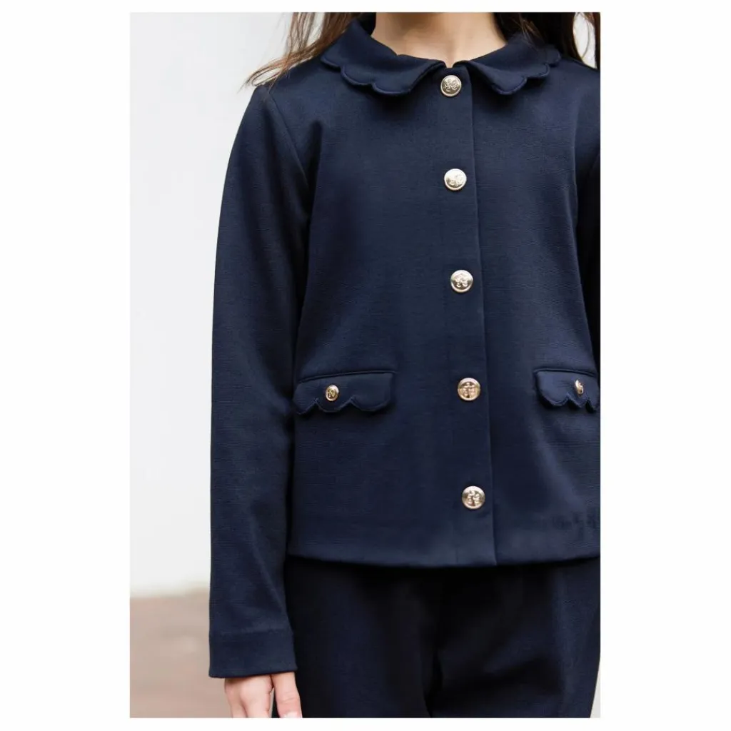 - Ensemble pour junior fille, en coloris marine, composé d’une veste délicate au col Claudine, agrémentée de poches décoratives et de boutons dorés, accompagnée d’un pantalon assorti. Un duo chic et raffiné, parfait pour habiller votre enfant avec élégance et douceur.
