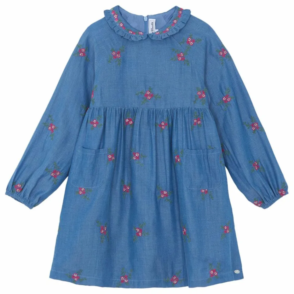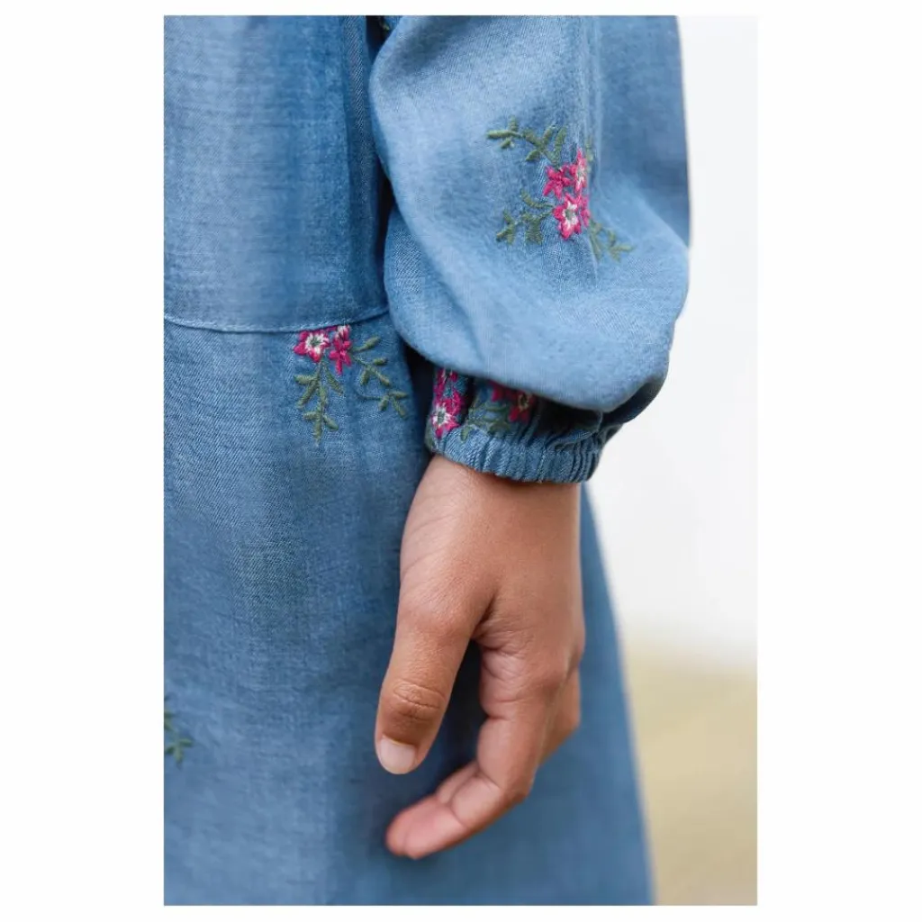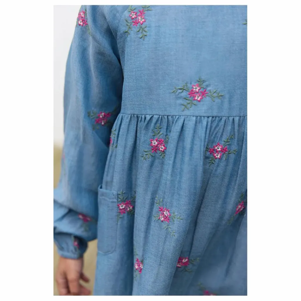 - Cette robe pour junior fille, en chambray couleur denim, est rehaussée de délicates fleurs coloris magenta qui lui apportent une touche poétique. Dotée d’un col volanté et de deux poches plaquées sur le devant, elle combine charme et décontraction pour un look du quotidien tout en douceur.