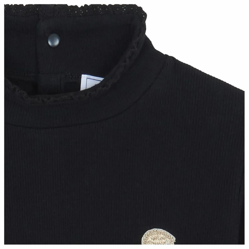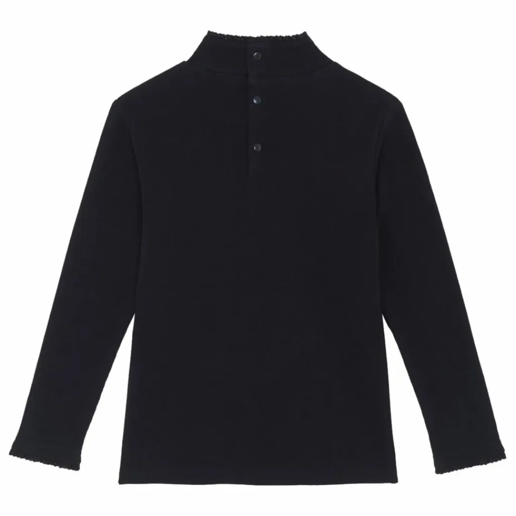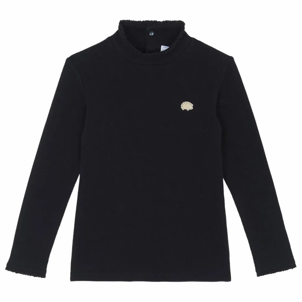 - Ce sous-pull noir au col cheminé festonné apporte une touche élégante et intemporelle aux tenues hivernales des junior filles. On craque pour son écusson hérisson doré, symbole de Tartine et Chocolat, qui ajoute un détail charmant et raffiné. À porter seul ou sous un cardigan pour une allure chic et chaleureuse.