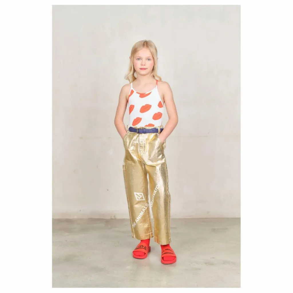 - Pantalon en métal doré. Brillant et tendance, avec l’imprimé The Animals Observatory sur la jambe, parfait pour les enfants à la pointe de la mode.