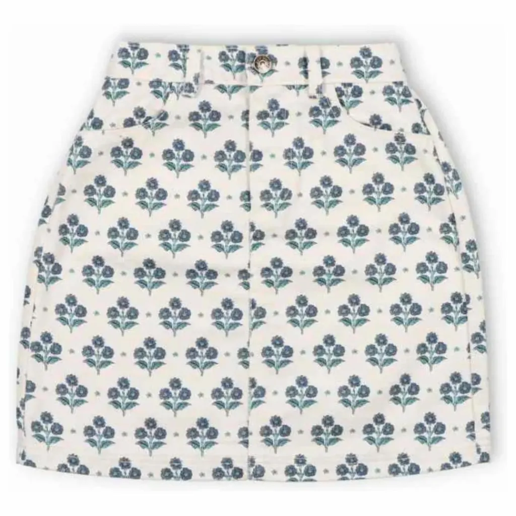 - Jupe courte en denim avec un joli imprimé et une fente sur le devant avec fermeture par bouton de marque.