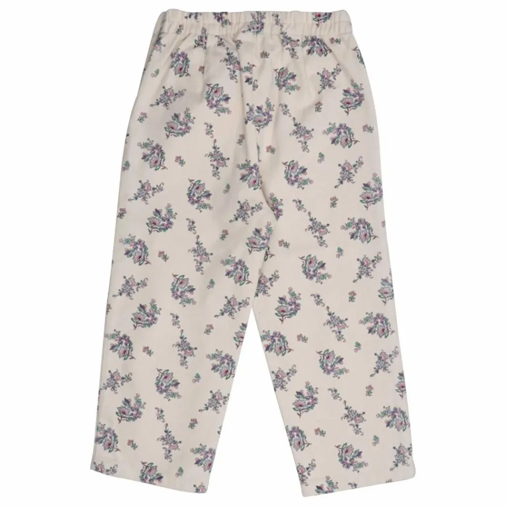- Pantalon en denim à imprimé floral avec poches surpiquées et boutons en bois sur les côtés. Il est doté d’une ceinture élastique à l’arrière.
