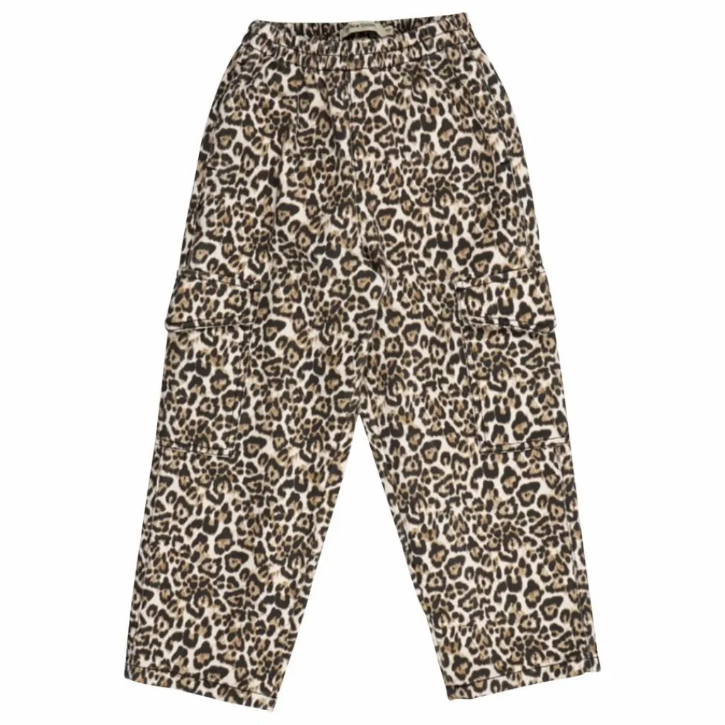 - Pantalon cargo en denim 100% coton BCI avec un imprimé léopard. Il est doté d’une ceinture élastique et de poches cargo latérales.
