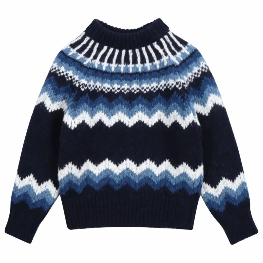 - Pull en laine avec un magnifique jacquard dans les tons bleus sur le devant, le dos et les manches.