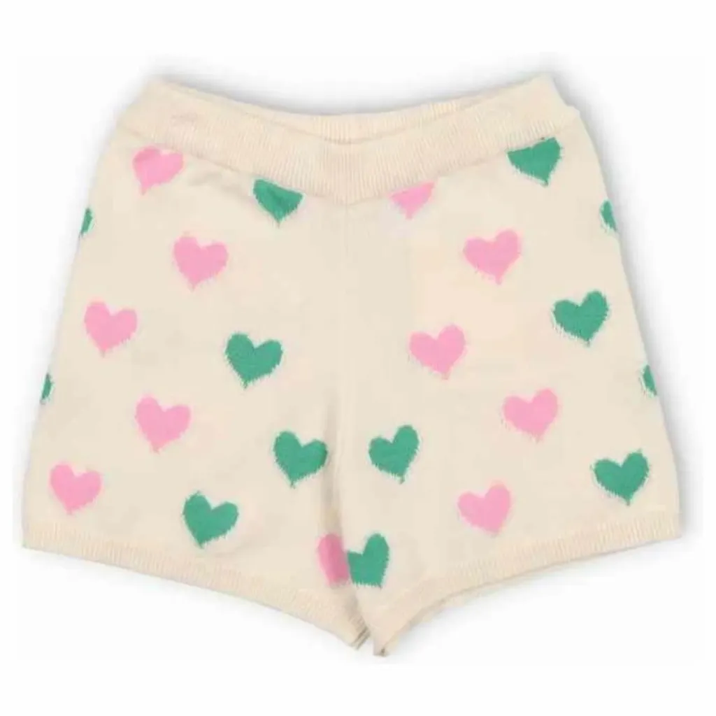 - Short en tricot avec un motif intarsia bicolore en forme de cœur et une taille élastique côtelée. Il est accompagné d’un haut assorti pour créer un look estival parfait.