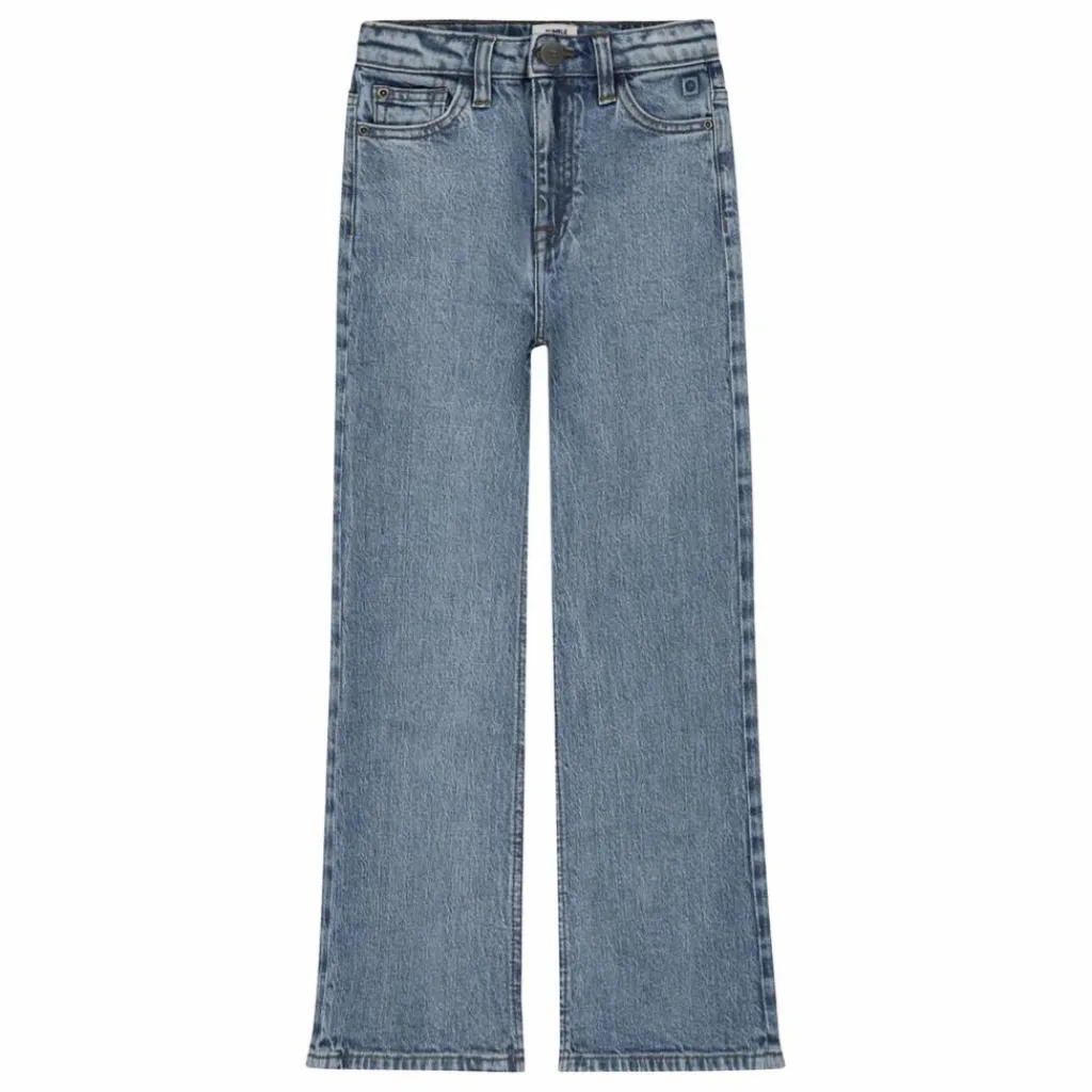 - Ce jean à cinq poches, en denim clair délavé, a une coupe large.