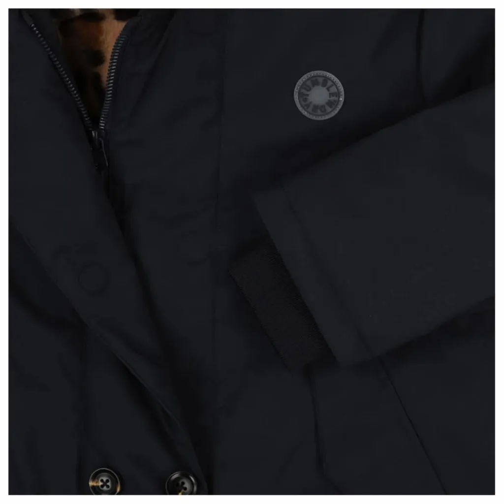 - Ce manteau d’hiver bleu foncé est doté d’une fermeture à glissière, d’une fermeture à bouton magnétique, de poignets côtelés, de deux poches à rabat avec fermeture à bouton-pression, d’une doublure en fausse fourrure douce à imprimé léopard et d’une poche intérieure à fermeture velcro. La doublure est en rembourrage Sorona et le manteau a une finition Bionic eco.