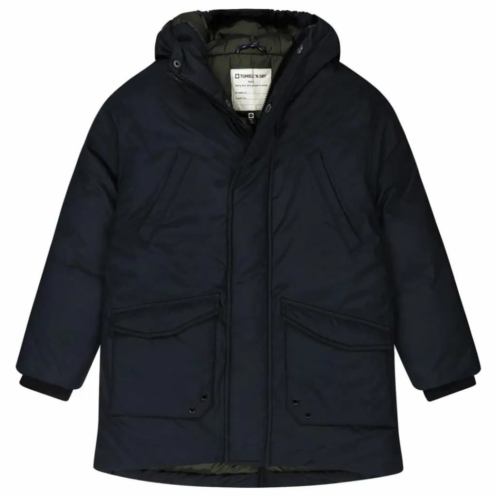 - Ce manteau d’hiver gris foncé est fabriqué en 100% polyester recyclé et a un intérieur vert foncé. En outre, le manteau est doté d’une fermeture à glissière et à boutons-pression, d’une capuche, de deux poches sur la poitrine et de deux poches latérales sur le devant.