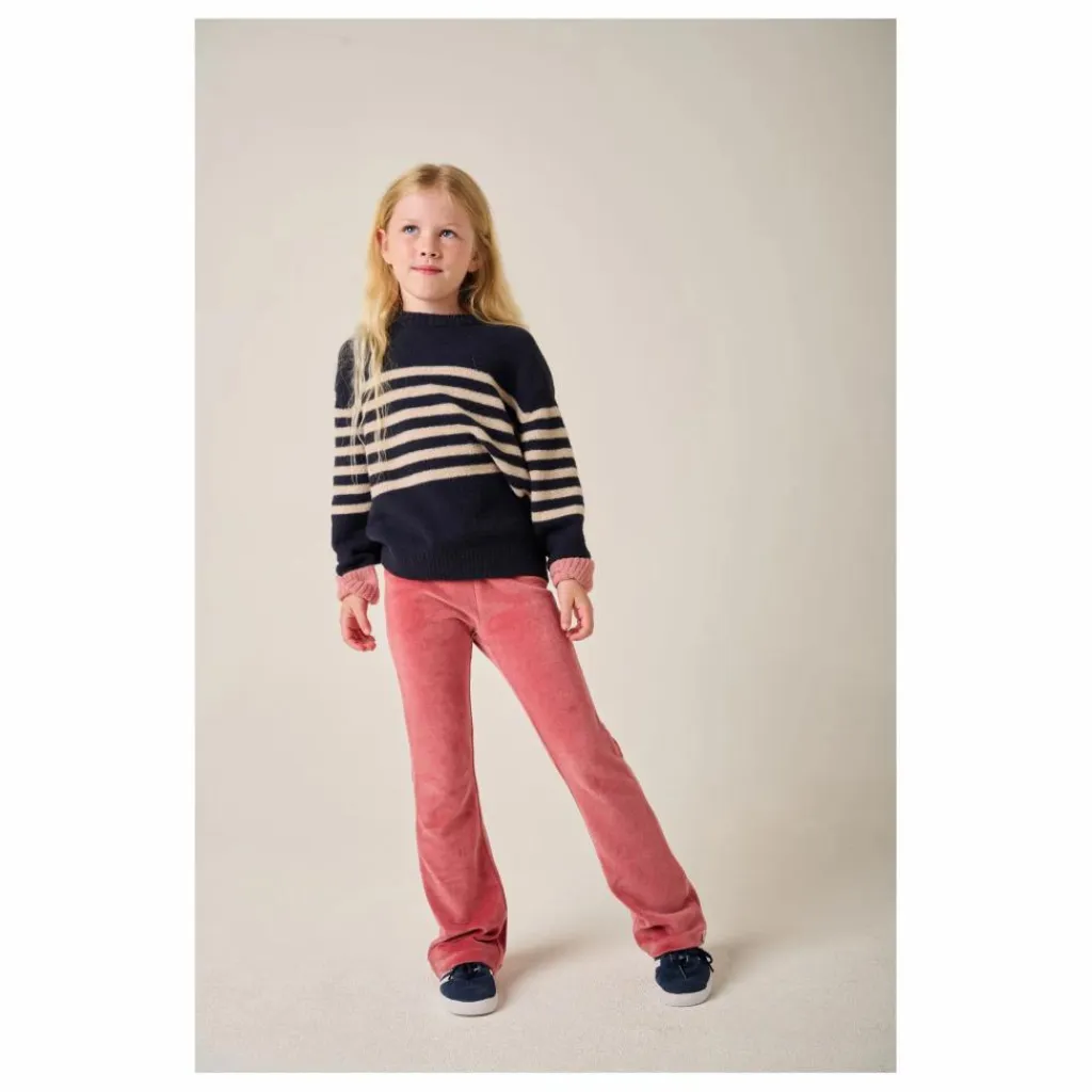 - Ce pull doux et tricoté présente des bords côtelés robustes, une bande tricotée avec du lurex et une couleur rose contrastante au bas des manches.