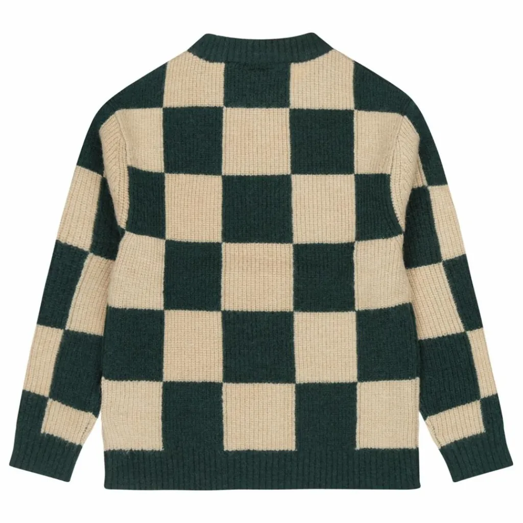 - Ce pull doux et tricoté présente des bords côtelés robustes et un motif de blocs tricotés.
