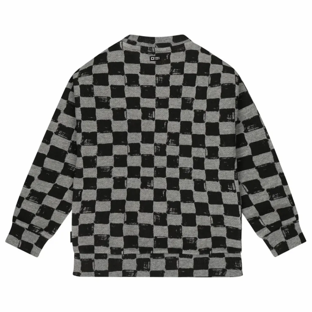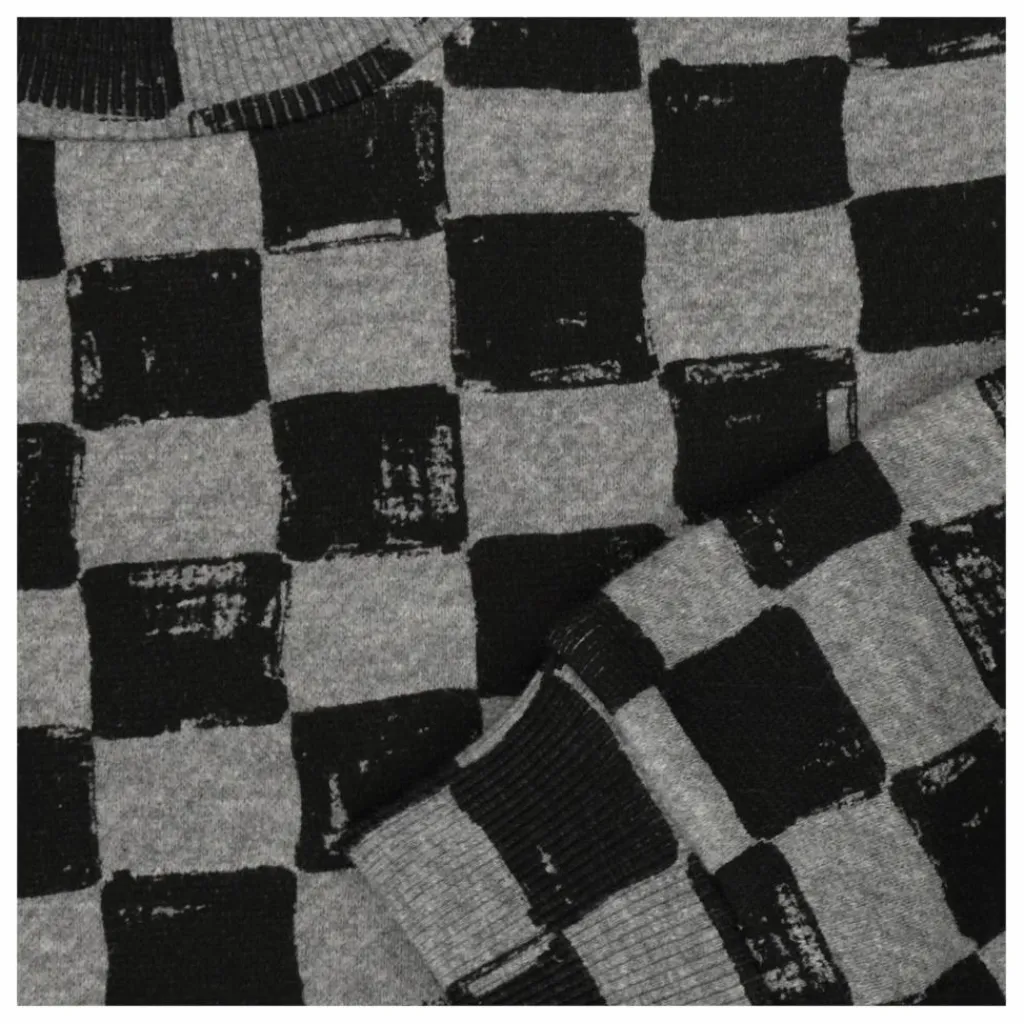 - Ce pull gris doux et surdimensionné présente un imprimé en damier et des poignets côtelés.