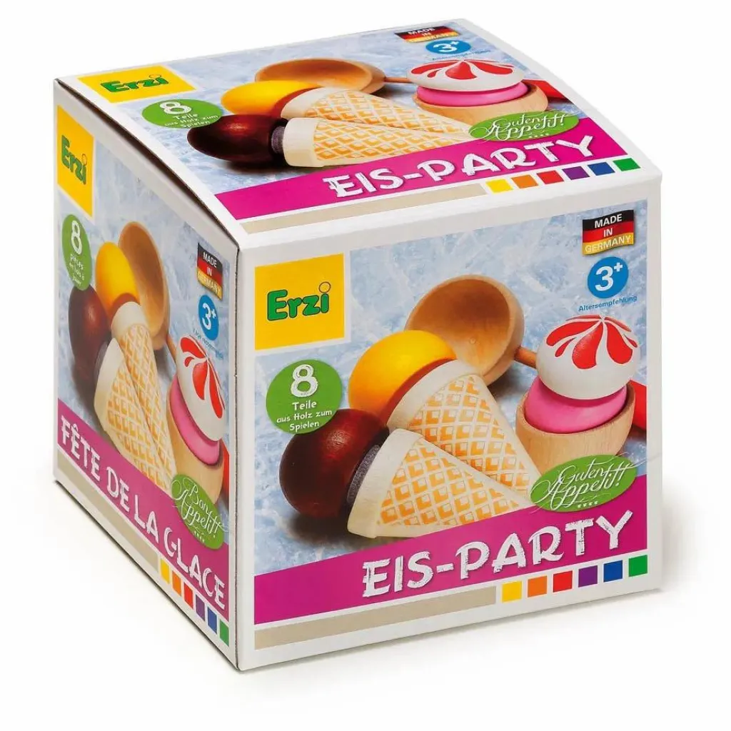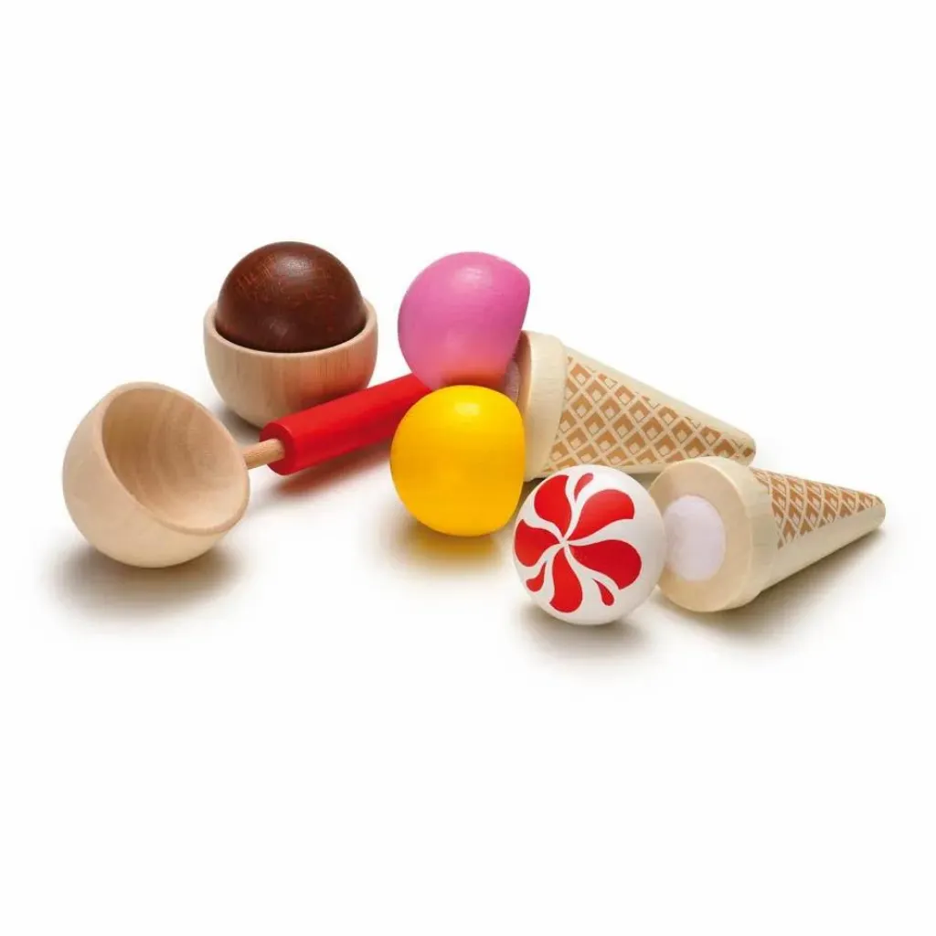 - 1 cuillère à glace, 1 coupe à glace, 2 cornets à glace, 1 boule de glace rose, 1 boule de glace brune, 1 boule de glace jaune, 1 crème glace avec sauce à la fraise