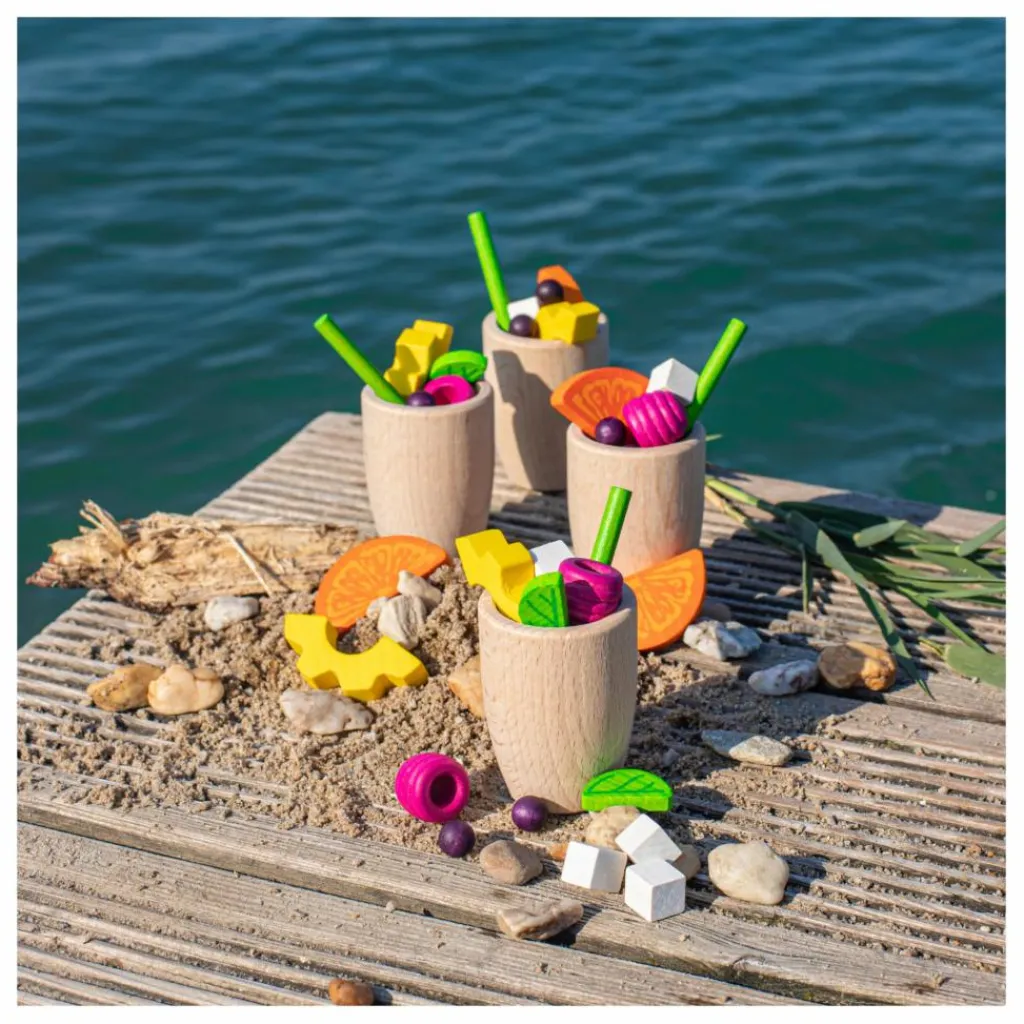 - 4 tasses, 4 pailles à boire, 4 framboises, 4 tranches d’orange, 4 tranches d’ananas, 8 myrtilles, 8 glaçons, 4 feuilles de menthe