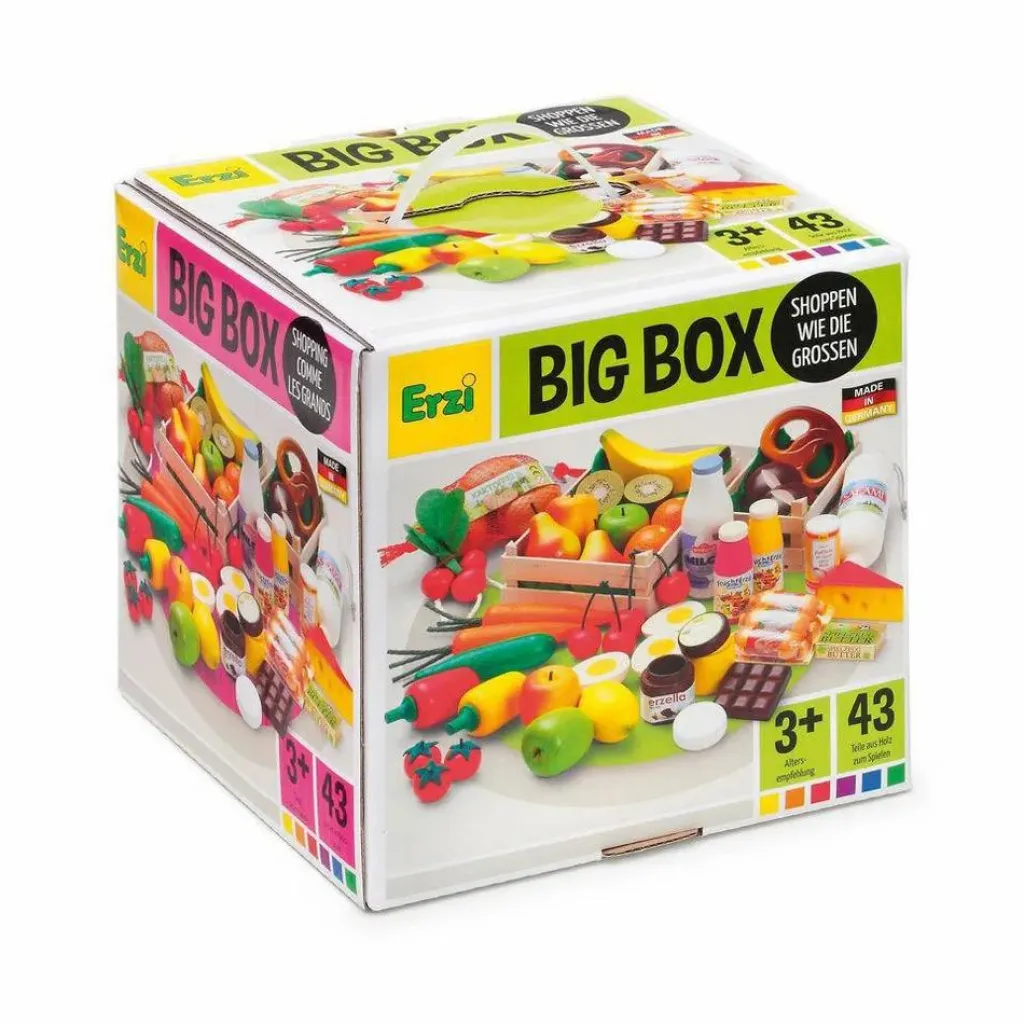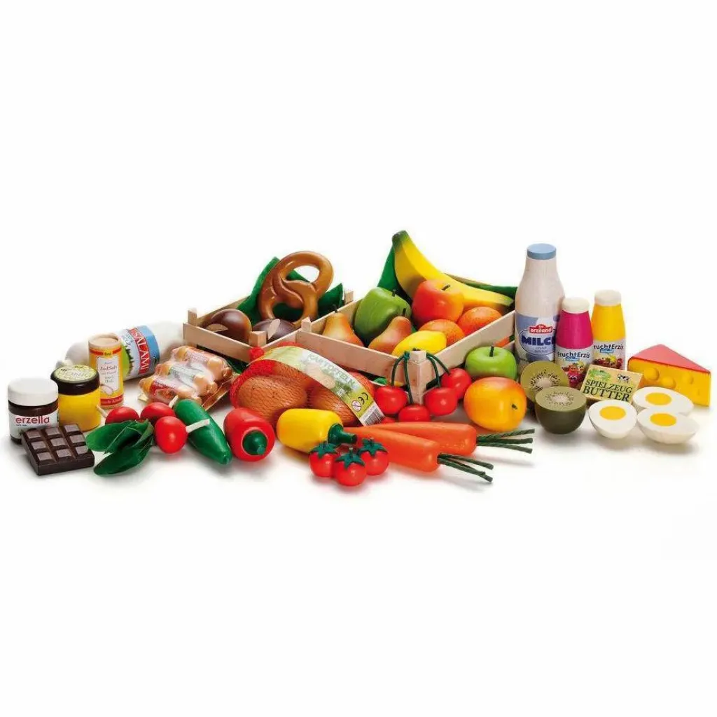 - 1 grande cagette de fruits, grande, 1 petite cagette de fruits, 2 pommes, jaune-rouge, 2 pommes vertes, 2 poires vert-rouge, 2 cerises, 2 oranges, 1 citron, 1 banane, grande, 2 demi-kiwis, 1 pomme de terre en filet , 2 carottes, 3 tomates, 1 radis, 1 concombre, 1 poivron, jaune, 1 poivron, rouge, 2 petits pains, 1 bretzel, 1 salami, 1 saucisse à tartiner, 1 edam, 1 miel, 1 mini-chocolat, 1 beurre, 3 demi-œufs, 1 bouteille de lait, 2 yaourts à boire aux fruits, 1 crème au chocolat Erzella, 1 sel