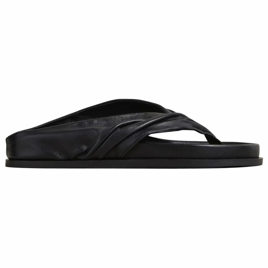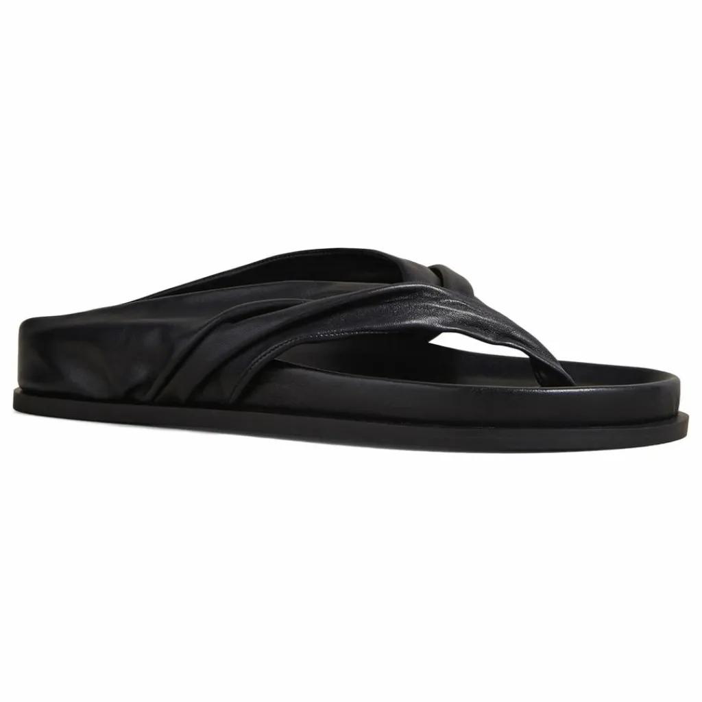 - La sandale Shaw, avec son assise plantaire moulée, présente deux généreuses brides froncées à la silhouette d’une tong, partant d’un seul point pour un look moderne.
