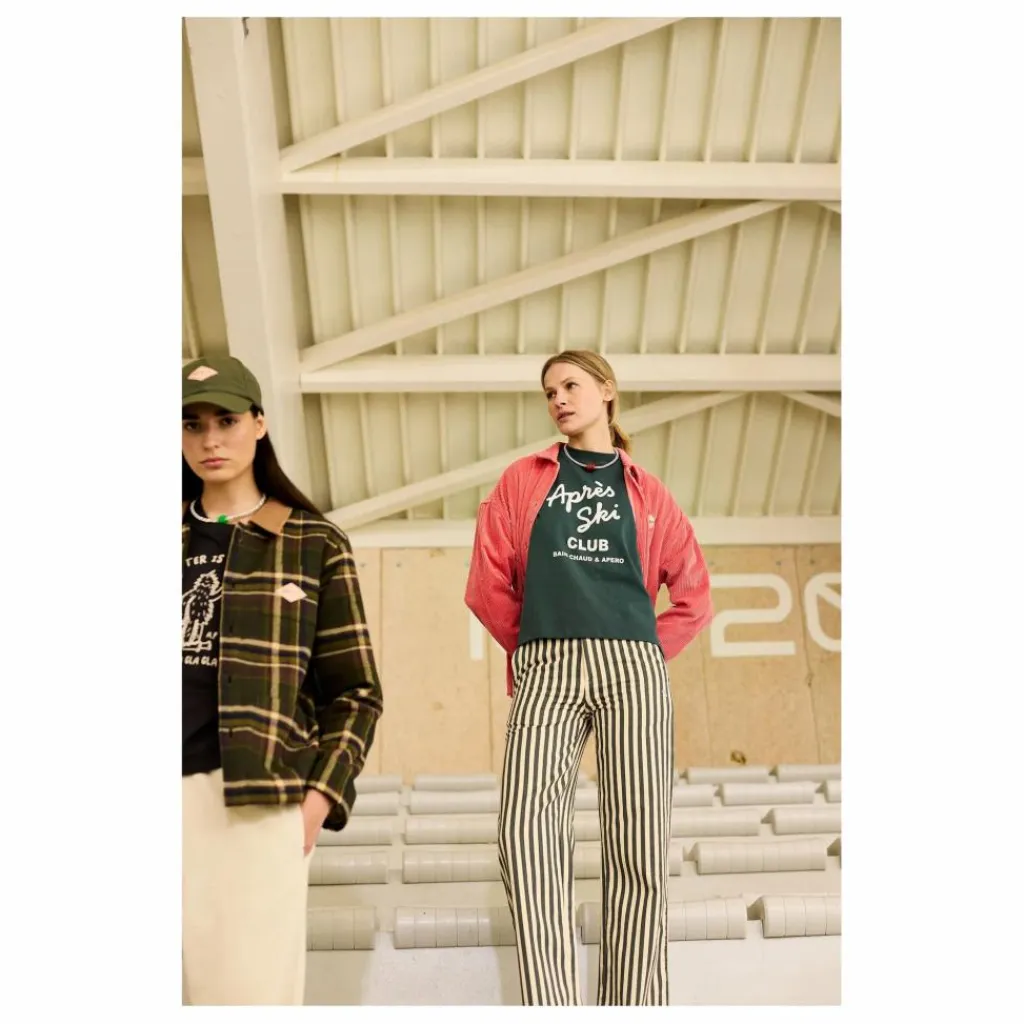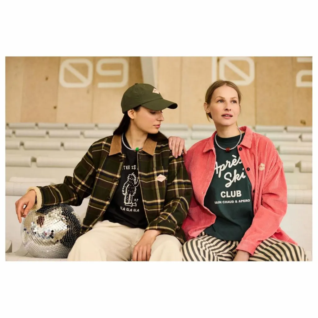 - T-shirt femme en jersey bio . – Col rond. – Manches courtes. – Finition bord cote au col. – Impression « Apres ski club » au milieu devant. – etiquette « pois bleu » cousue a la couture cote. – Existe en coloris ecru et vert foret.