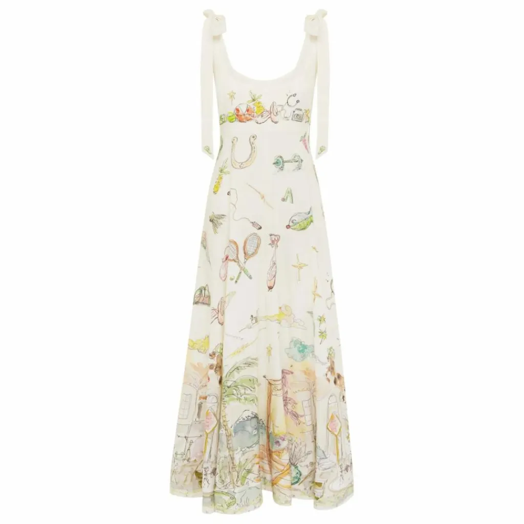 - Œuvre d’art en collaboration avec Anouk Colantoni Silhouette midi sundress Bretelles à nouer Panneau froncé au dos Fermeture éclair invisible sur le côté Poches à l’entrejambe