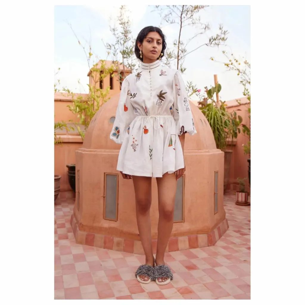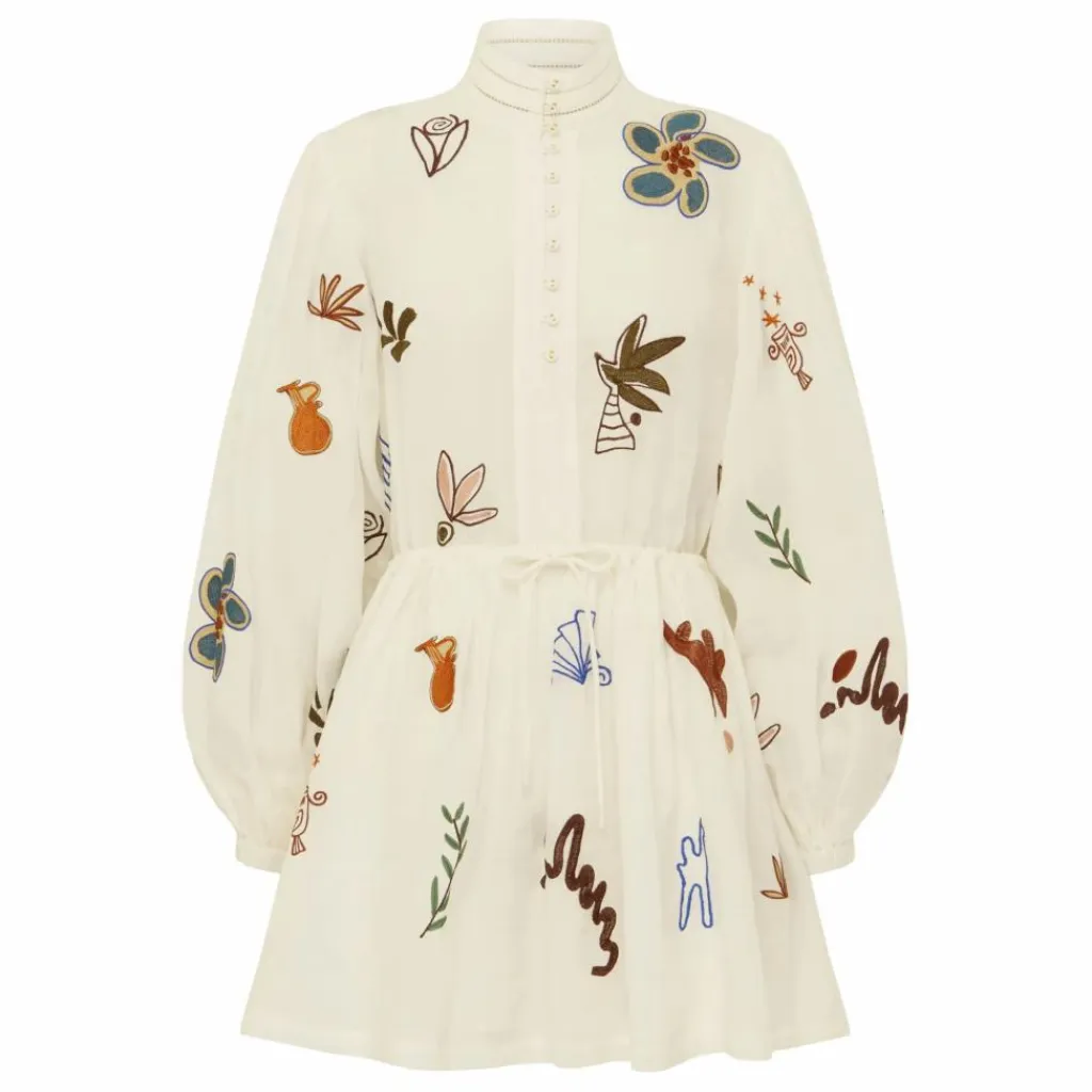 - – Oeuvre d’art en collaboration avec Laurence Leenaert – Silhouette de mini robe décontractée – Motifs brodés – Col rond – Boutons recouverts – Manches bouffantes avec poignet élastiqué – Cordon de serrage ajustable à la taille – Se référer aux photos du produit à plat pour une représentation fidèle de la couleur du produit.