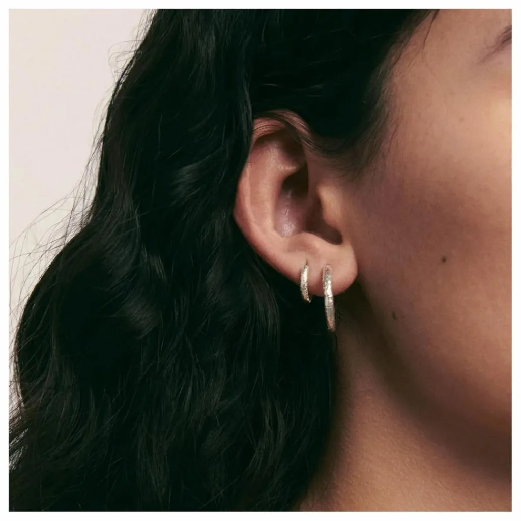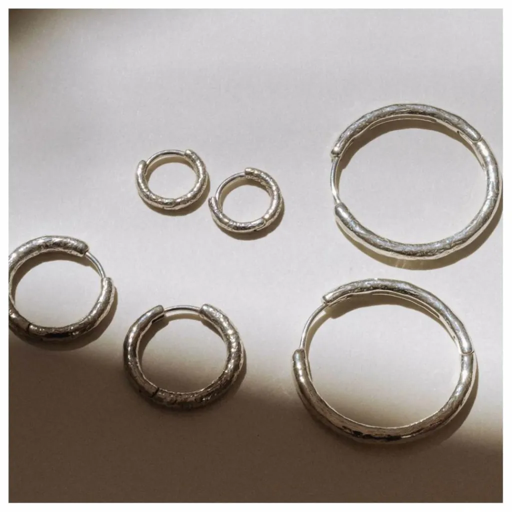 - Paire de cerceaux à la surface rugueuse, délicate et imparfaite, inspirée des cerceaux flamenco mais avec un poids approprié pour un usage quotidien. Ils ont l’équilibre parfait entre un simple anneau et un bijou spécial et unique. Entièrement en argent 925.