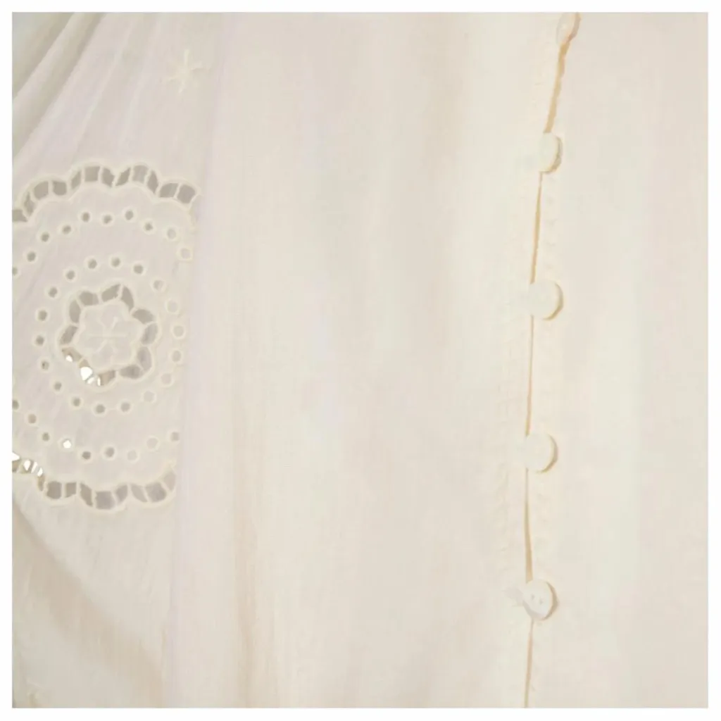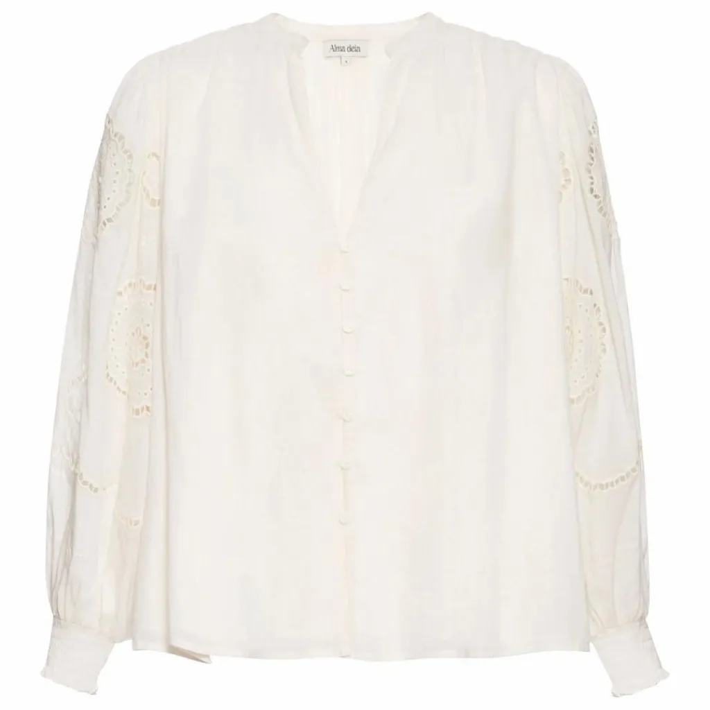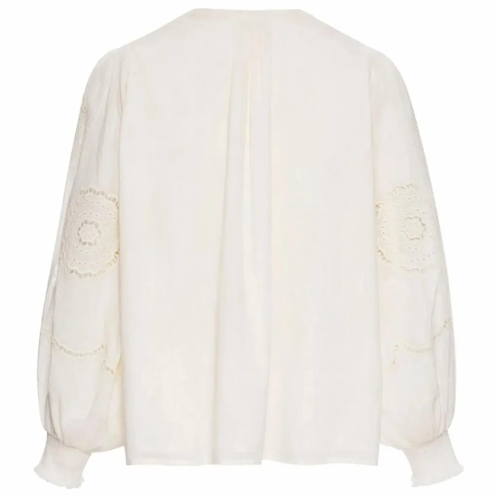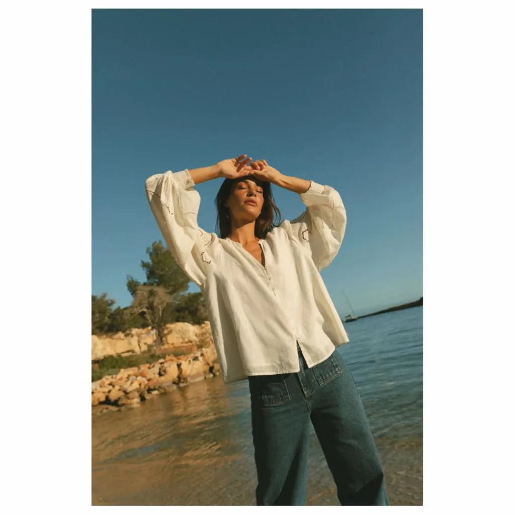 - Broderie anglaise, Manches longues bouffantes, Ajouré(s), Col mao