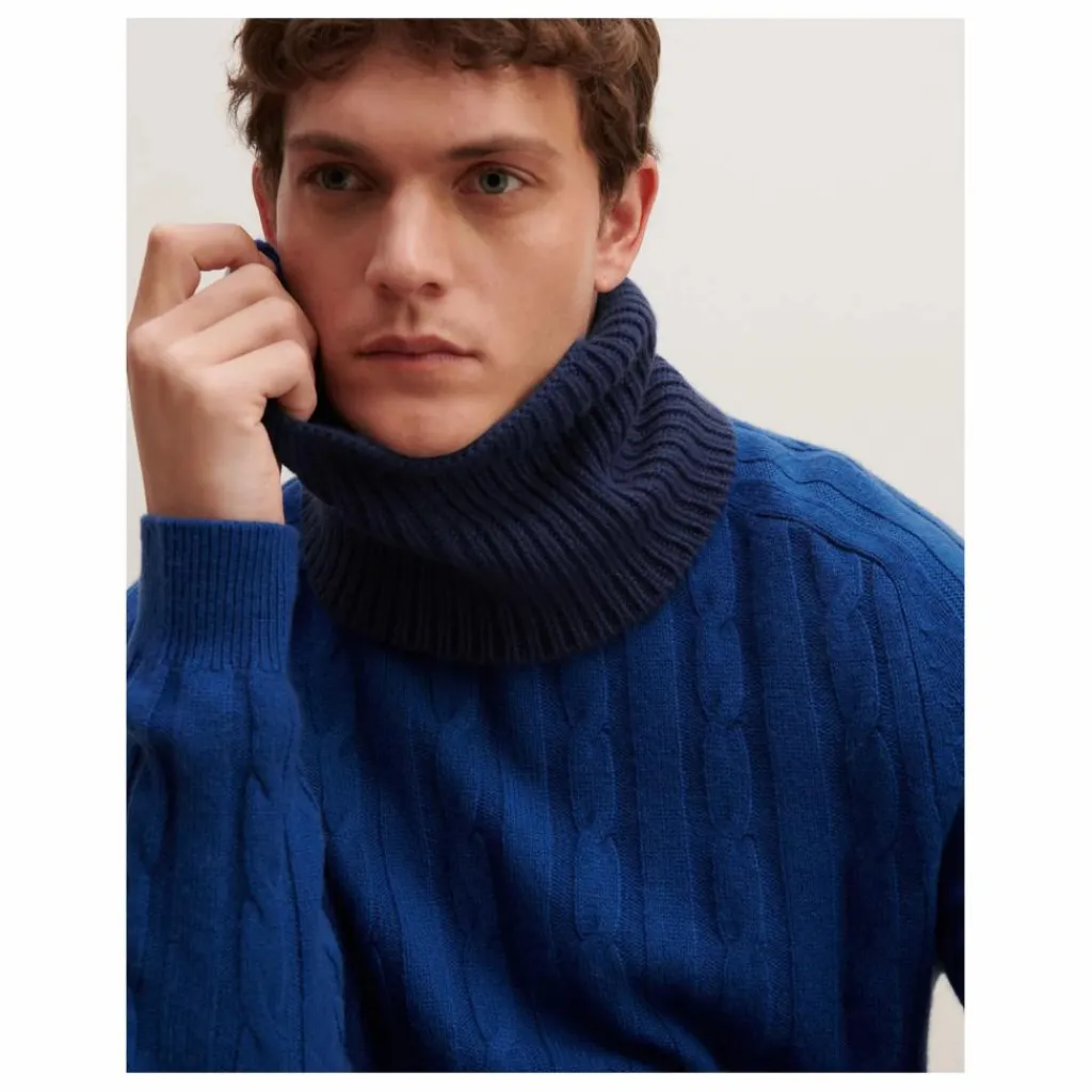 - Ce tour de cou douillet, qui allie fonctionnalité et style, protège du froid grâce à sa maille généreuse en cachemire 12 fils. Son tricot côtelé apporte une touche d’authenticité à la silhouette.