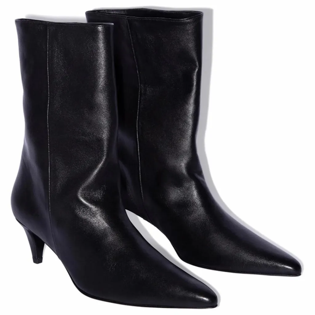 - Botte en cuir souple avec un talon recouvert de cuir de 6 cm et un design décontracté à enfiler à mi-mollet. Bout pointu.