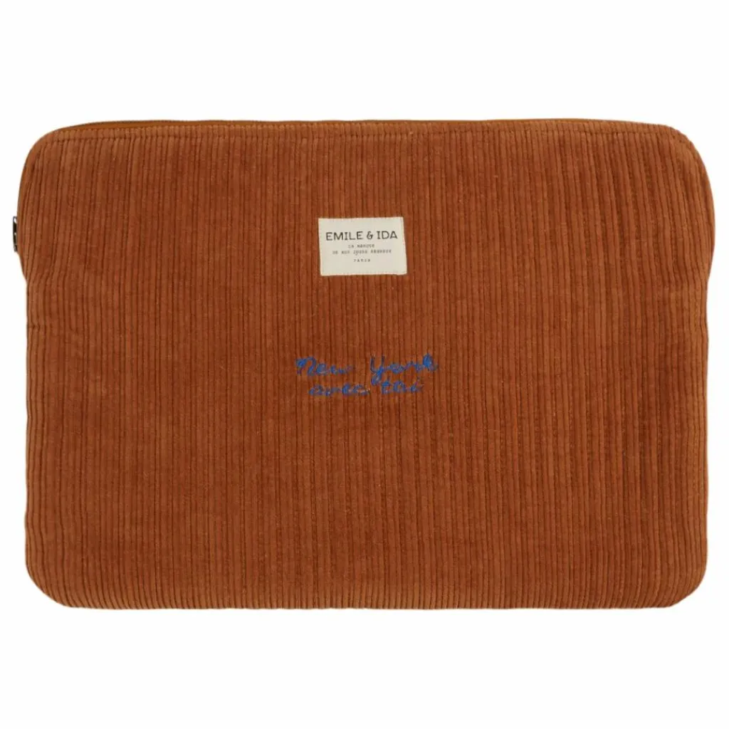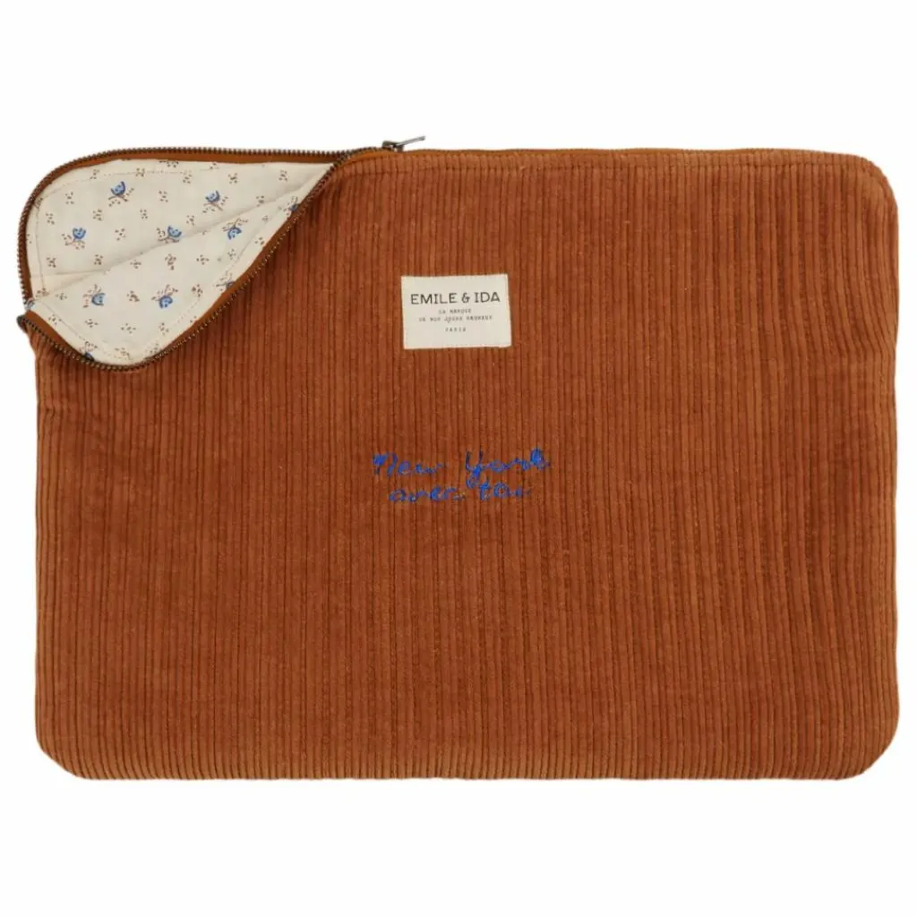 - Pochette d’ordinateur en velours de coton matelassé et surpiqué bleu.