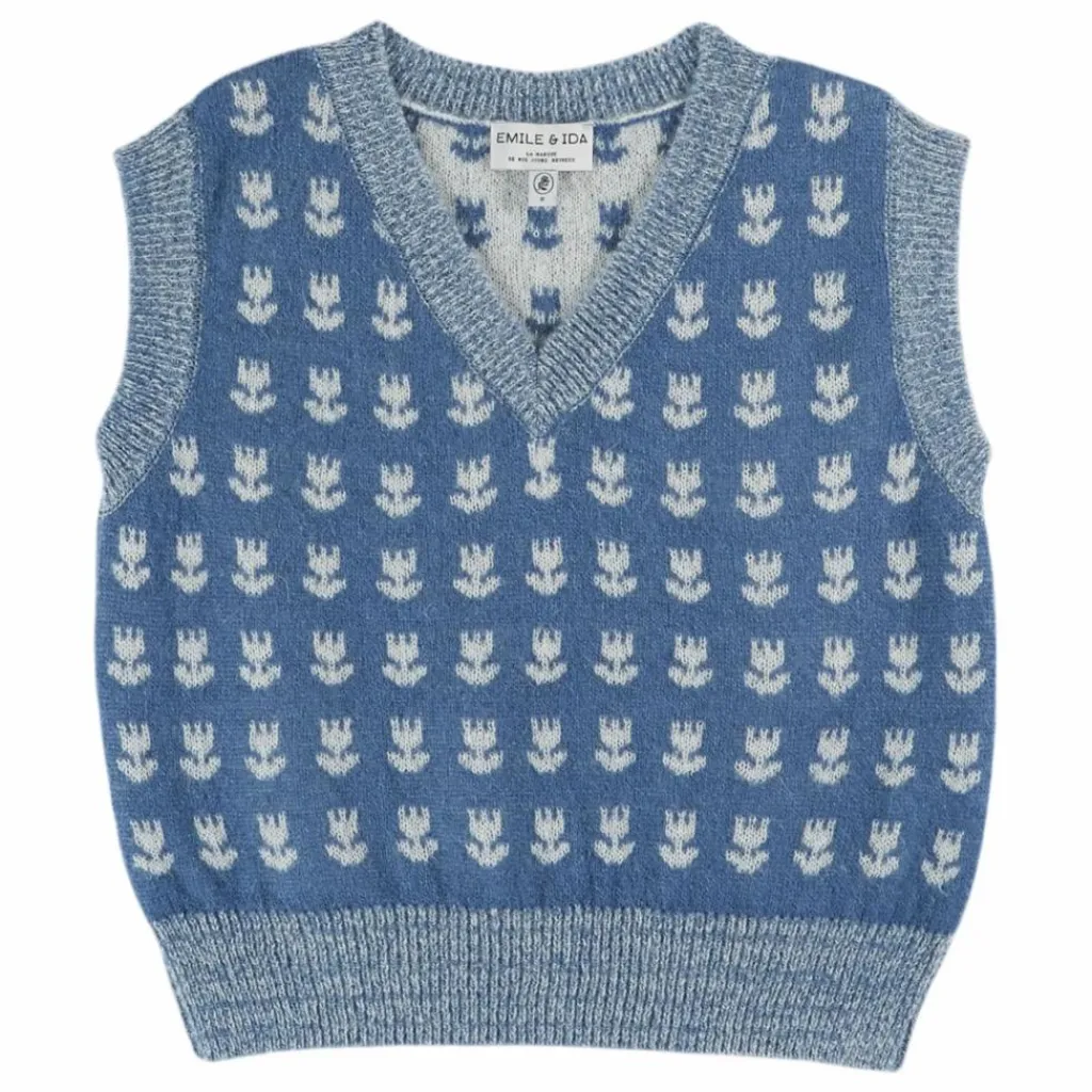 - Pull sans manches bleu en laine de mouton mélangée. Des rangs de tulipes blanches, aussi bien alignées que dans un jardin à la française, animent le devant et le dos du gilet.