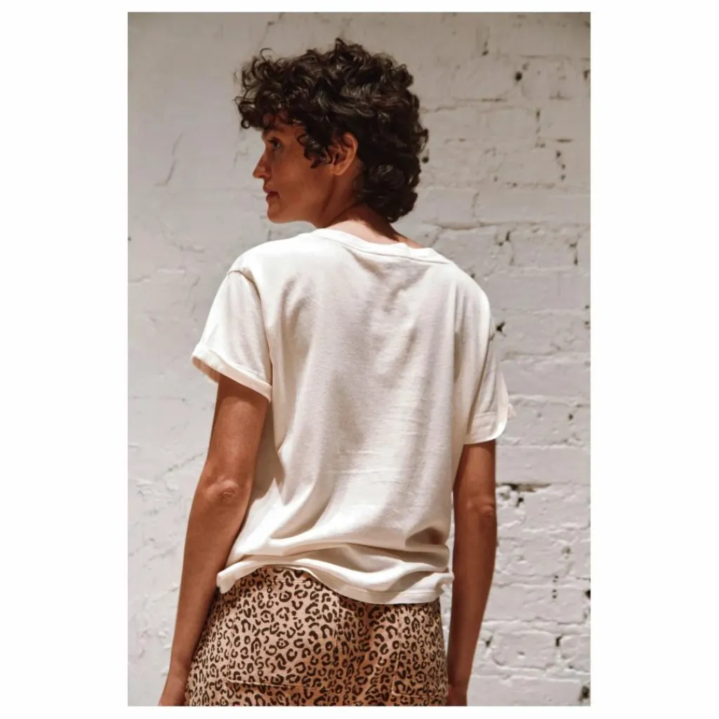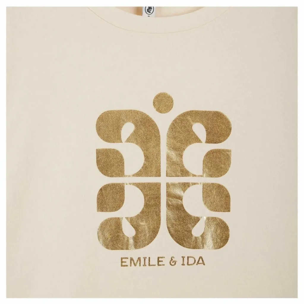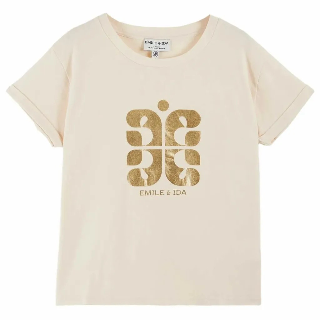 - Tee-shirt en jersey de coton biologique blanc cassé, orné du logo Émile et Ida floqué doré. Des tee-shirts, des tee-shirts, encore des tee-shirts… mais ici, uniquement des modèles de première classe : tout doux, tout moelleux. Il présente une encolure ronde bordée de bord-côte et des manches courtes ornées de revers.