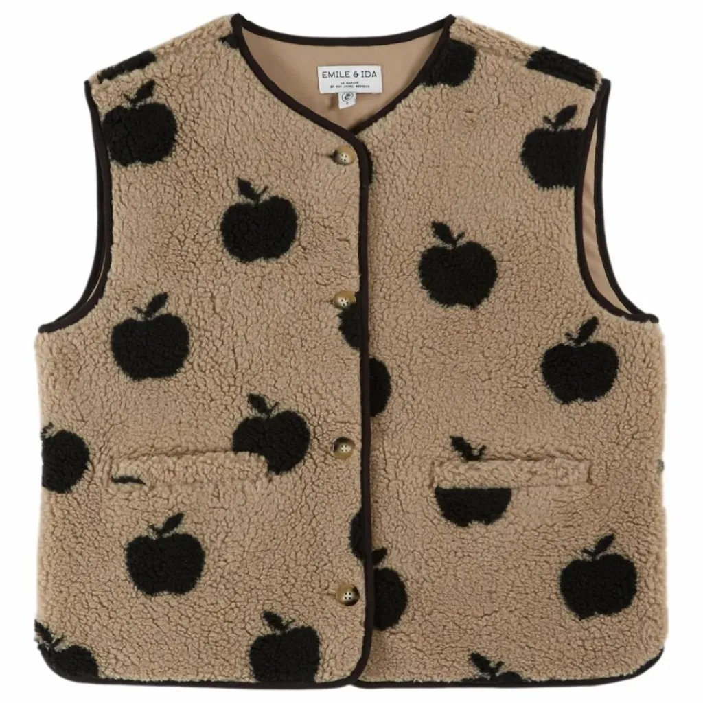 - Gilet sans manches en fourrure synthétique caramel imprimée d’écureuils beiges.