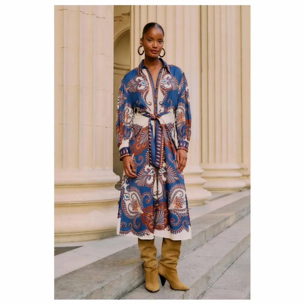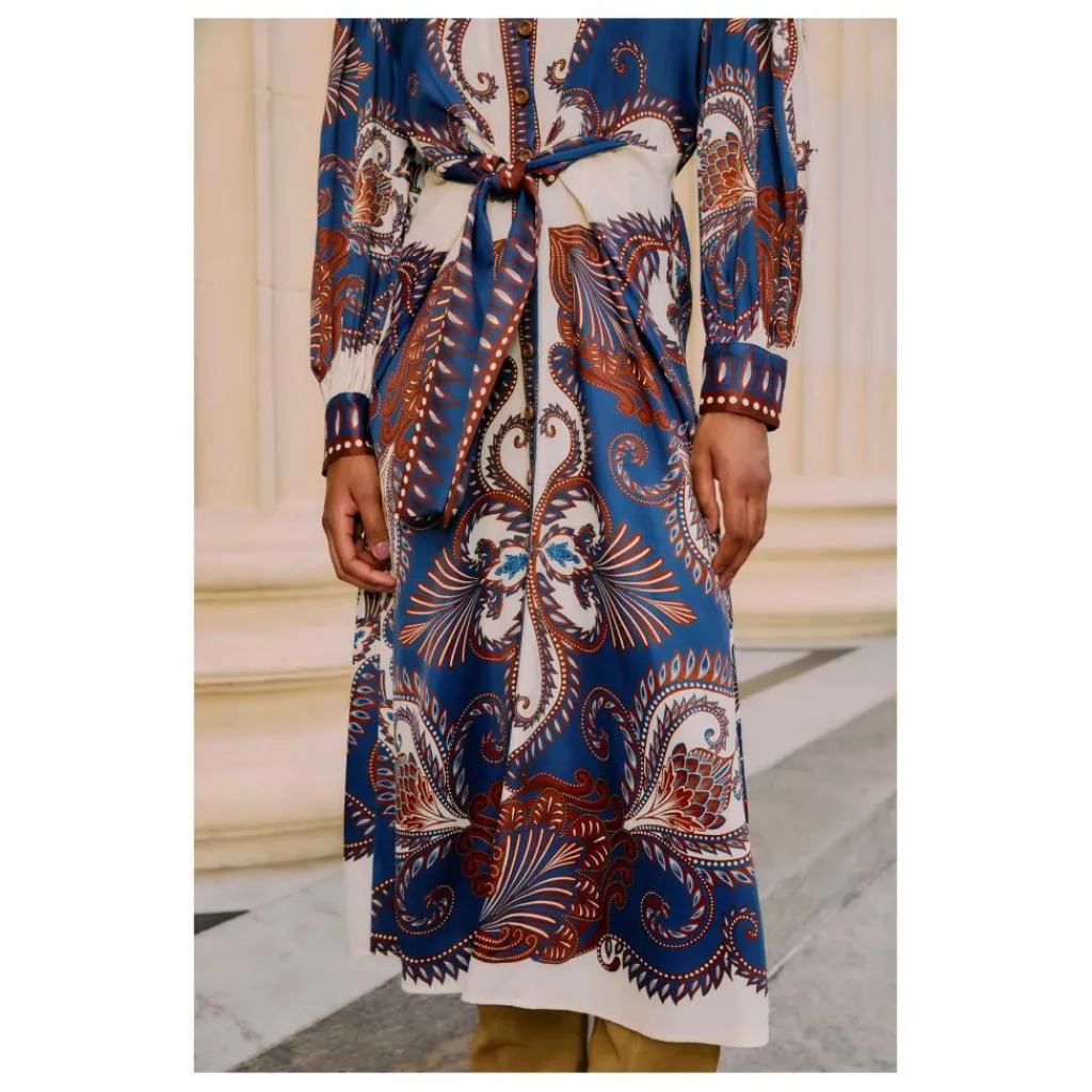 - ROBE MIDI BLEUE À FOULARD ARABESQUE
