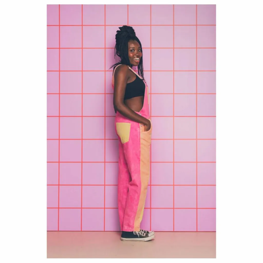 - Salopette longue rose, orange, jaune colour block, encolure droite et bretelles réglables avec fermeture salopette. Poches combinées sur le devant, style kangourou, deux poches arrière. Fermeture par boutons sur les côtés.