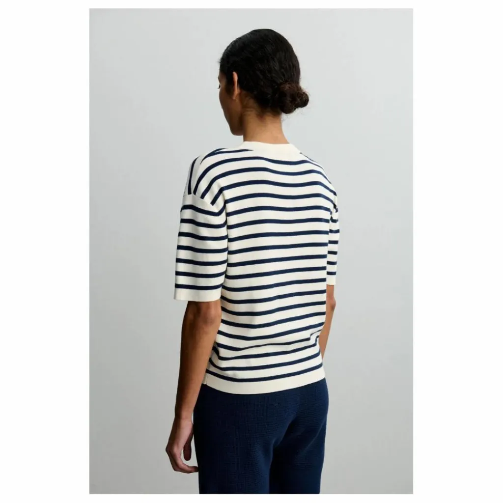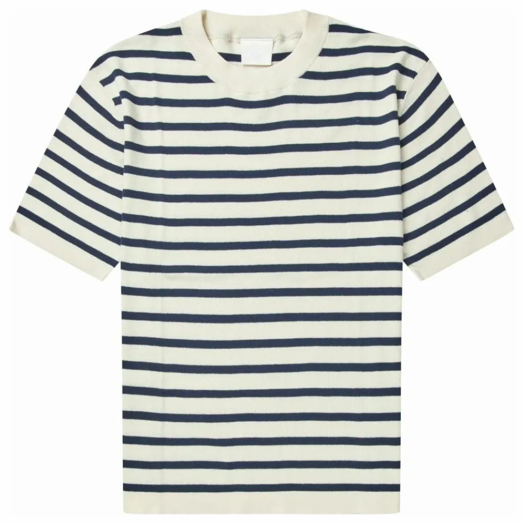 Fabriqué en coton biologique, ce tee-shirt présente des manches courtes et un col double épaisseur. Il a une coupe ample et est tricoté dans une structure côtelée 1×1 avec des rayures classiques teintes dans le fil sur toute la surface.