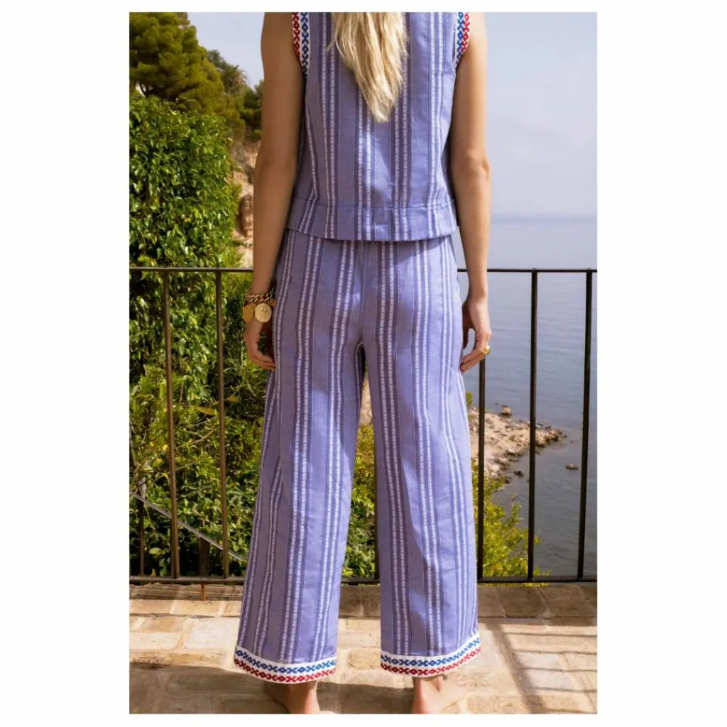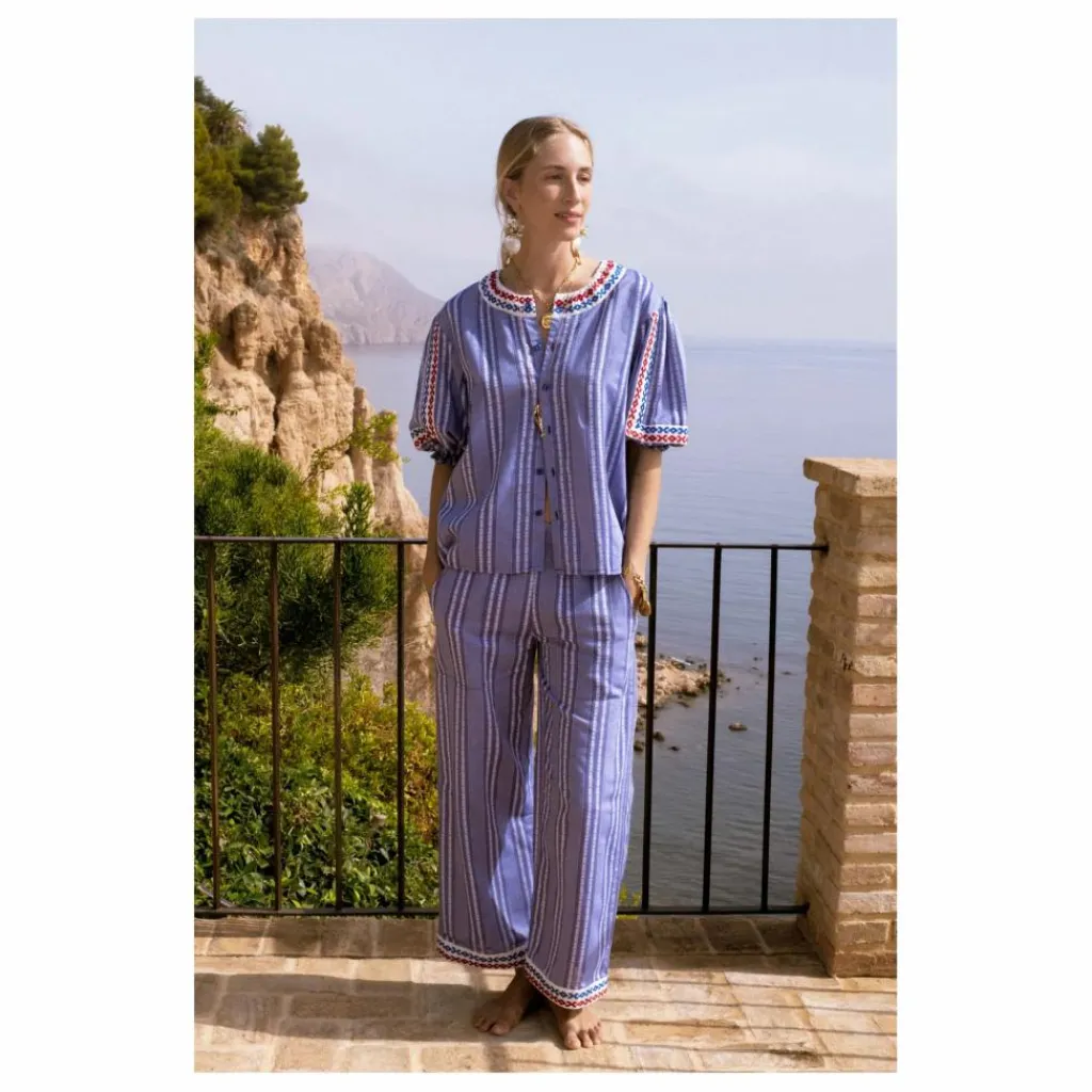 - Le pantalon Pietro est un basique pour toutes nos JoSephine. Il a quelques détails sur l’ourlet qui lui donnent une touche très JO et la meilleure chose est que la taille est élastique, donc il est super confortable. Il s’agit d’une réédition des collections précédentes. Il est fait à 100 % de coton, donc le tissu est doux et très confortable. De plus, le bleu à rayures provient de cette inspiration méditerranéenne que nous adorons.