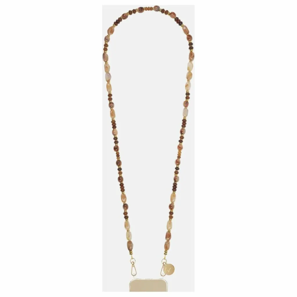 - Chaine longue Madison en perles semi precieuses beige et marron clair avec mousquetons dorés