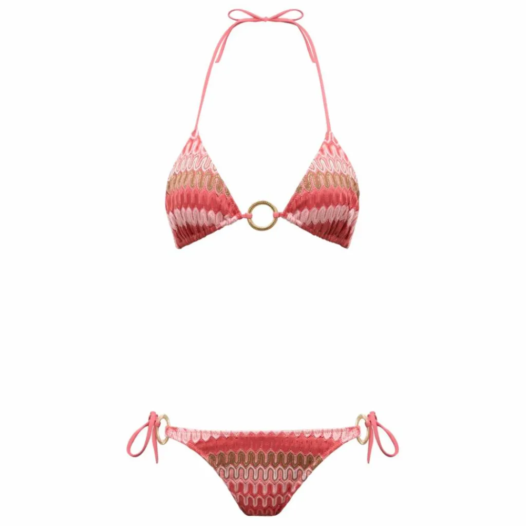 - Haut de maillot triangle en crochet corail, orné d’un anneau doré et de liens bijoux. Une pièce couture au style bohème et élégant, à porter à la plaget.
