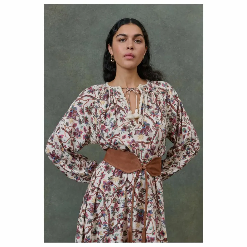Encolure en V avec détails de dentelle et liens avec pompons faits main.